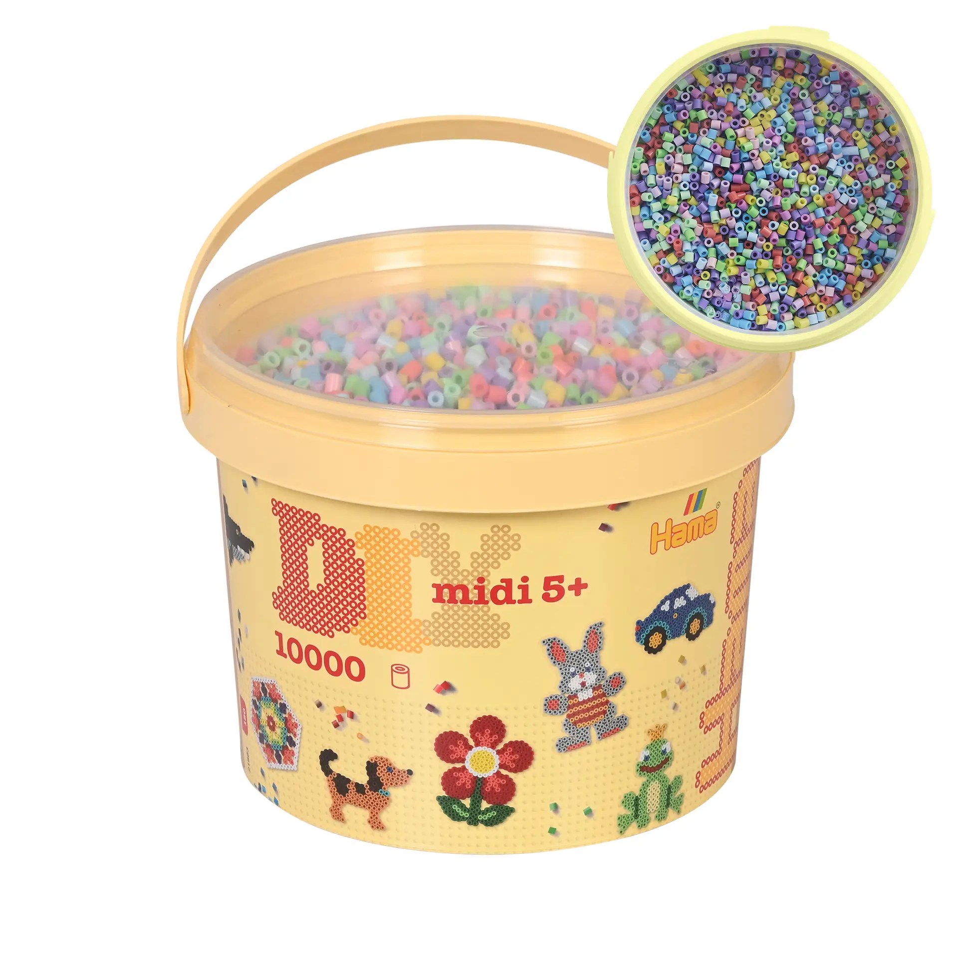 The set includes 10,000 midi beads in a mix of colours: pastel yellow, pastel red, pastel purple, pastel blue, pastel green, pastel pink, pastel rose, pastel lilac, pastel ice blue and pastel mint. Pair the beads with reusable heat‑resistant pegboards to build patterns and pictures, then place Hama ironing paper over the finished design and have an adult iron it to fuse the beads together. Once cooled, the creation can be peeled from the pegboard to reveal a long‑lasting decoration.