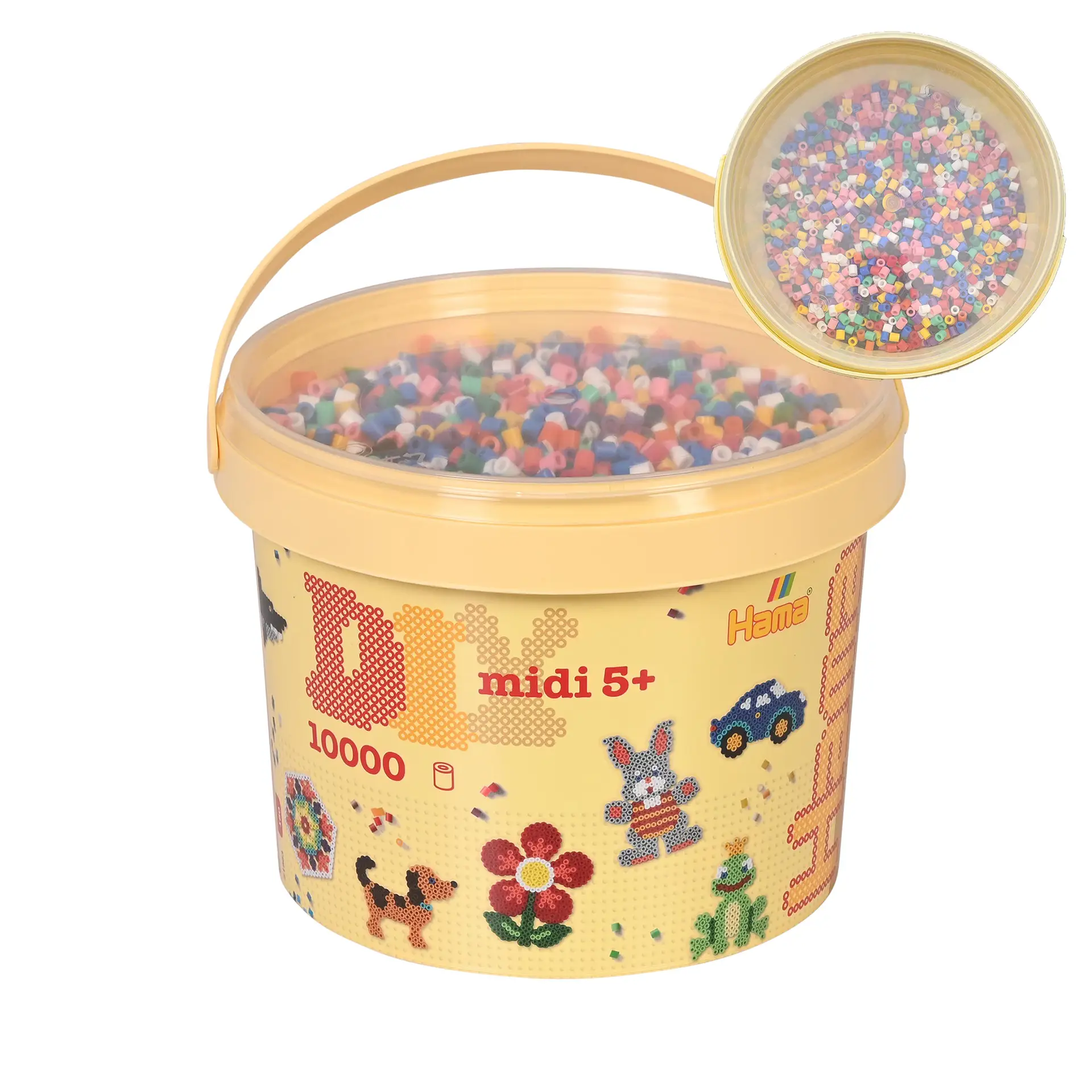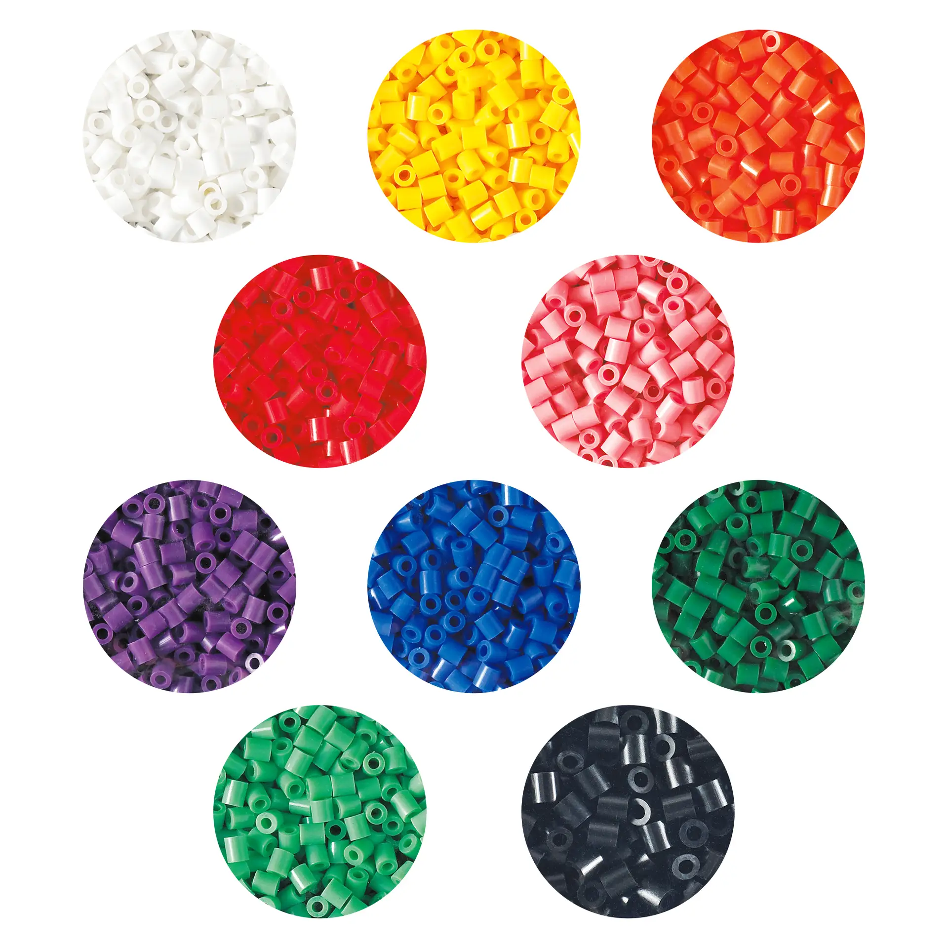 The set includes 10,000 midi beads in a vibrant mix of colours: white, yellow, orange, red, pink, purple, light blue, green, light green and black. Pair the beads with reusable heat‑resistant pegboards to build patterns and pictures, then place Hama ironing paper over the finished design and have an adult iron it to fuse the beads together. Once cooled, the creation can be peeled from the pegboard to reveal a long‑lasting decoration.