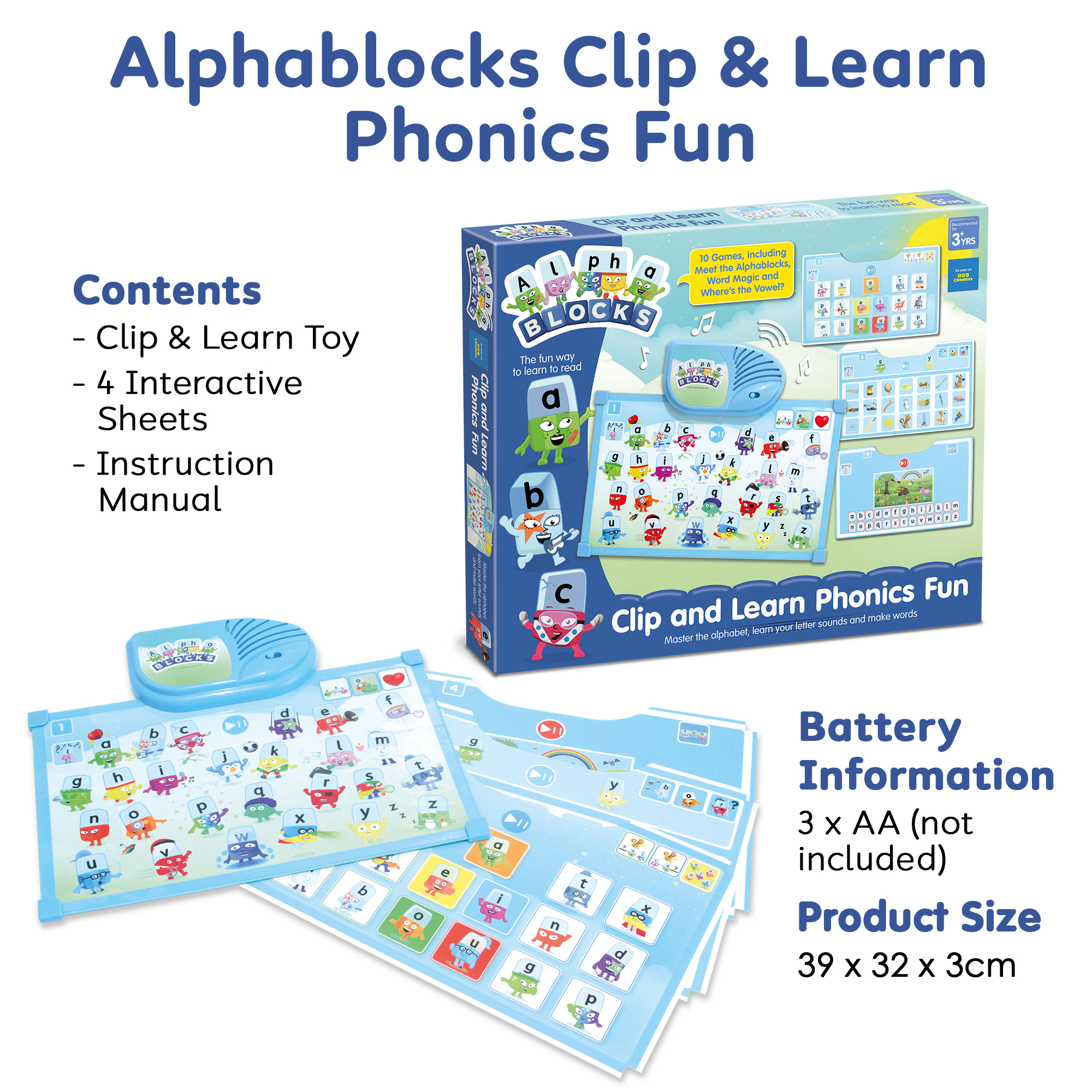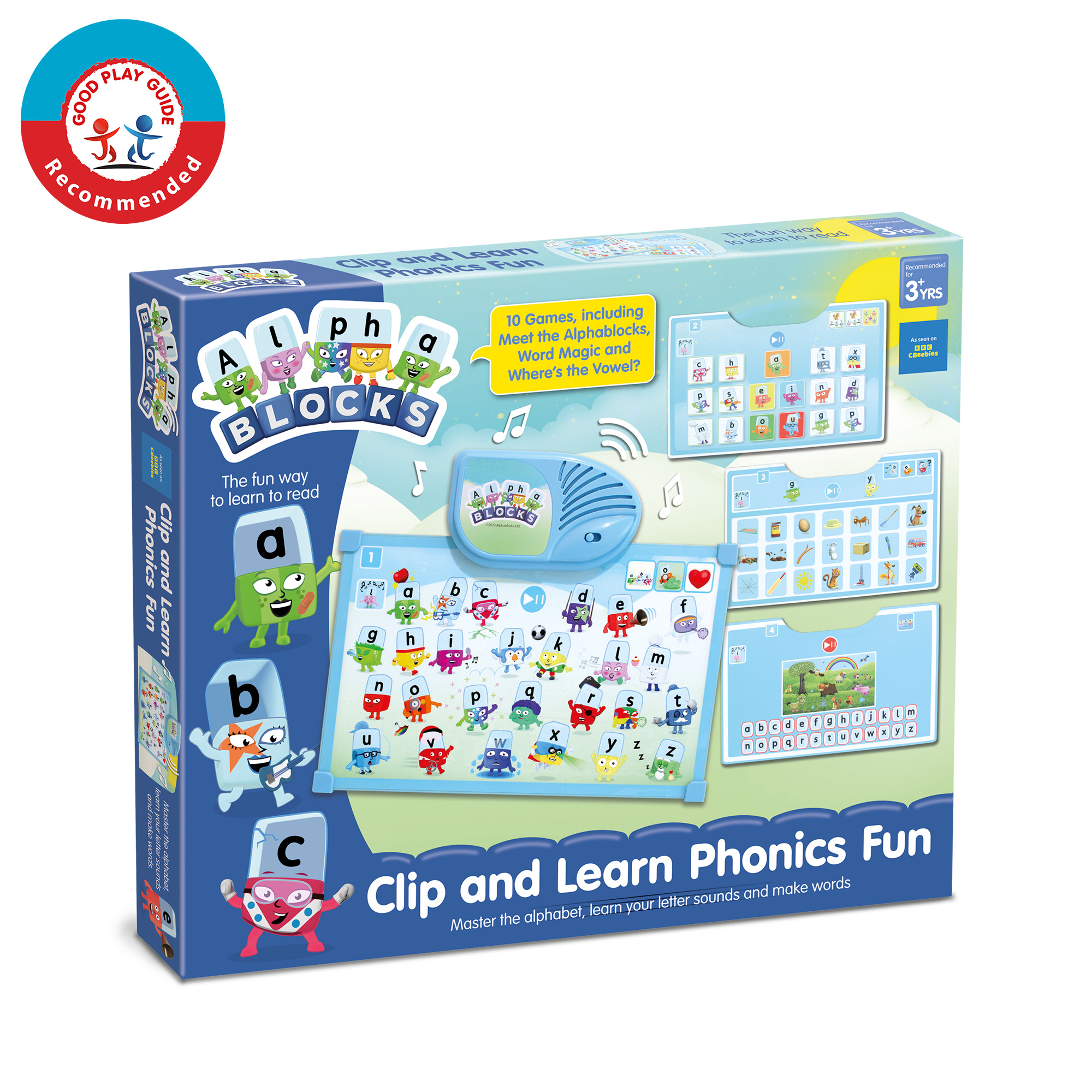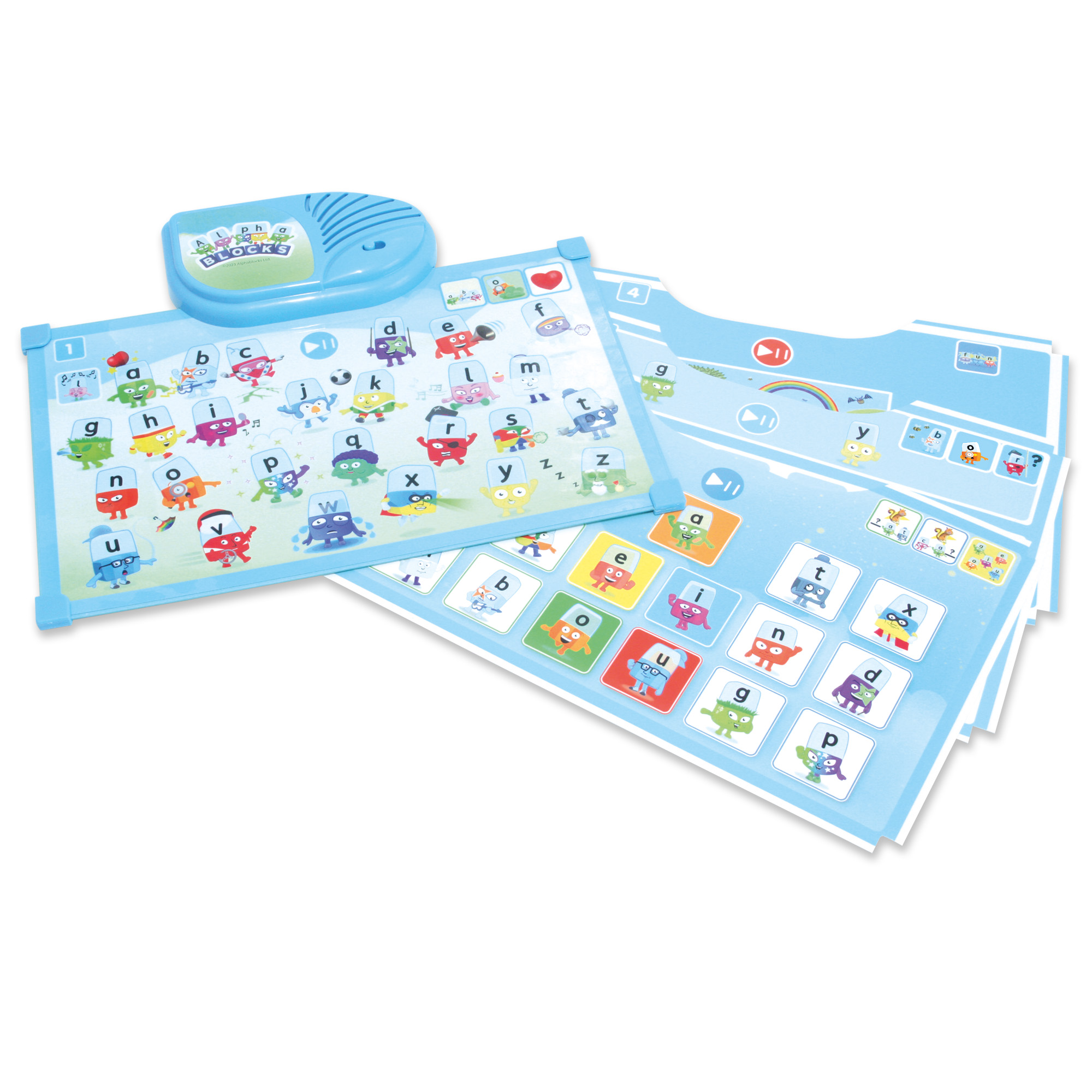 Getting started is simple: insert a play sheet, select a game using the Game Button and meet the Alphablocks. Each sheet introduces different activities; from identifying letters and sounds to spotting vowels and building words, keeping learning fresh, varied and motivating. As each activity is mastered, learners can move on to the next at the touch of a button.