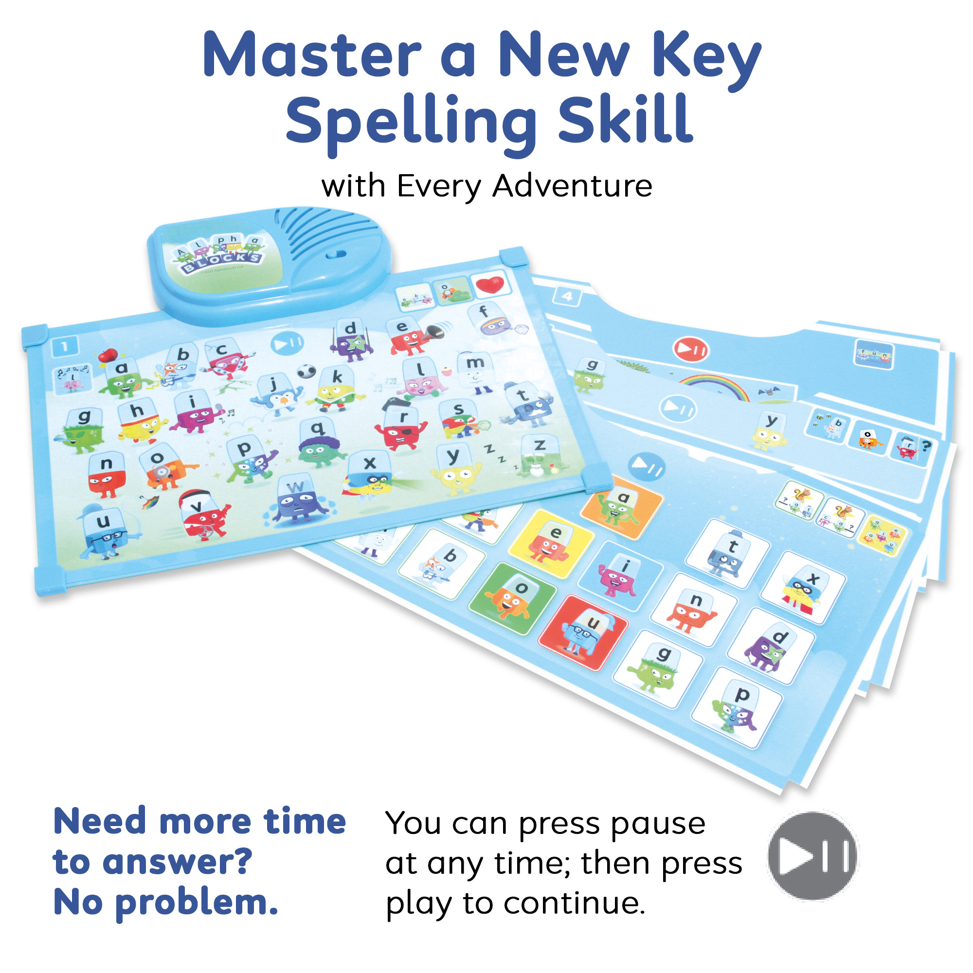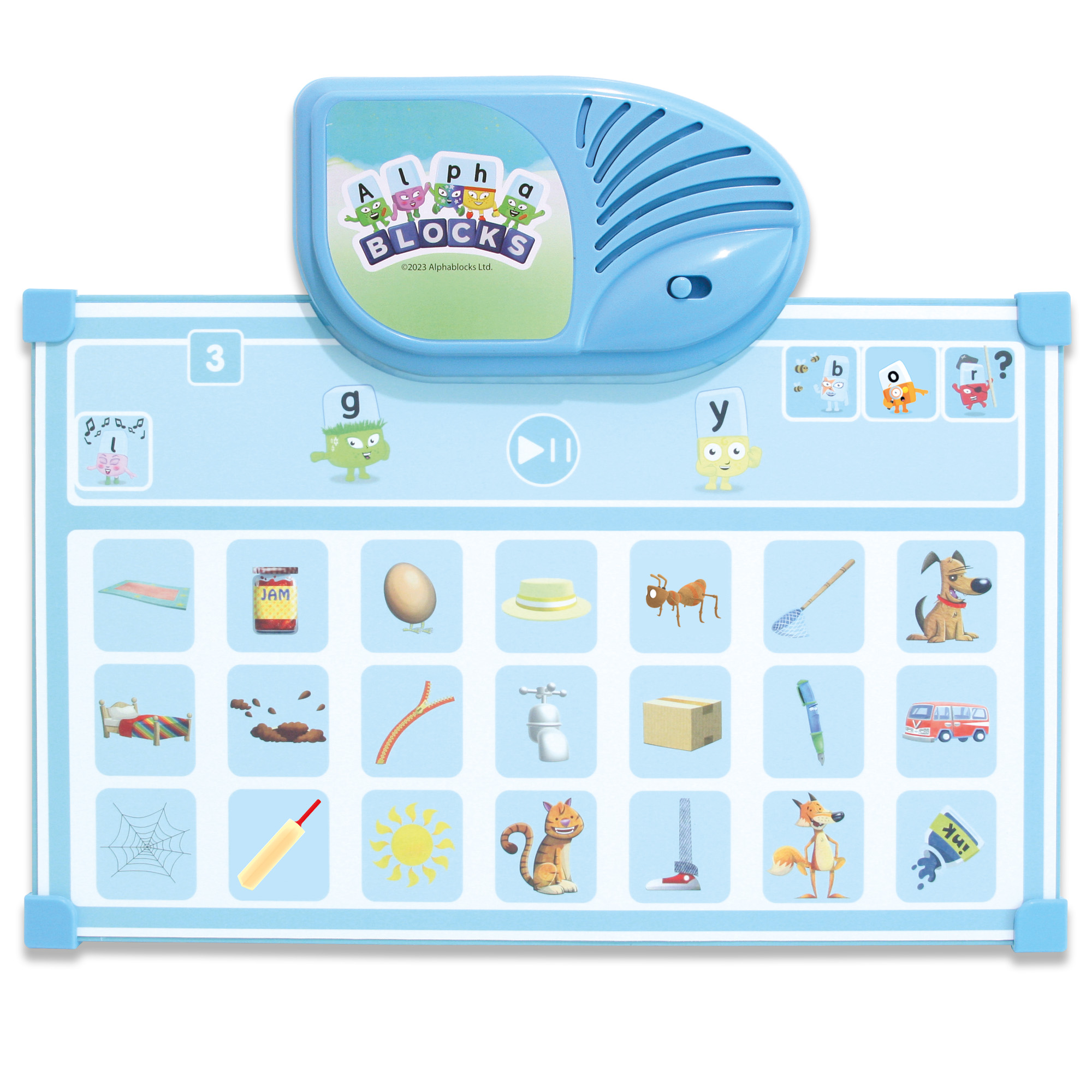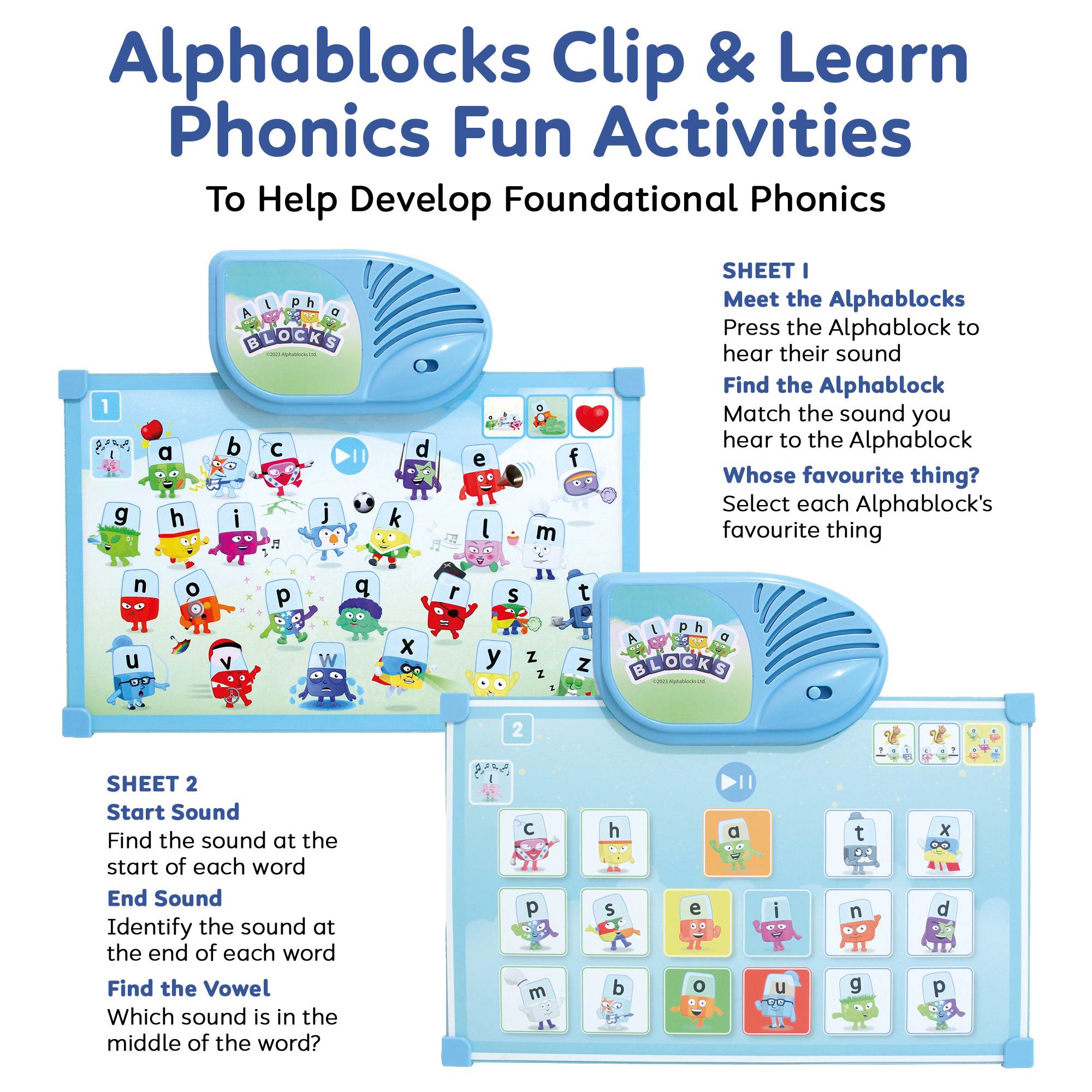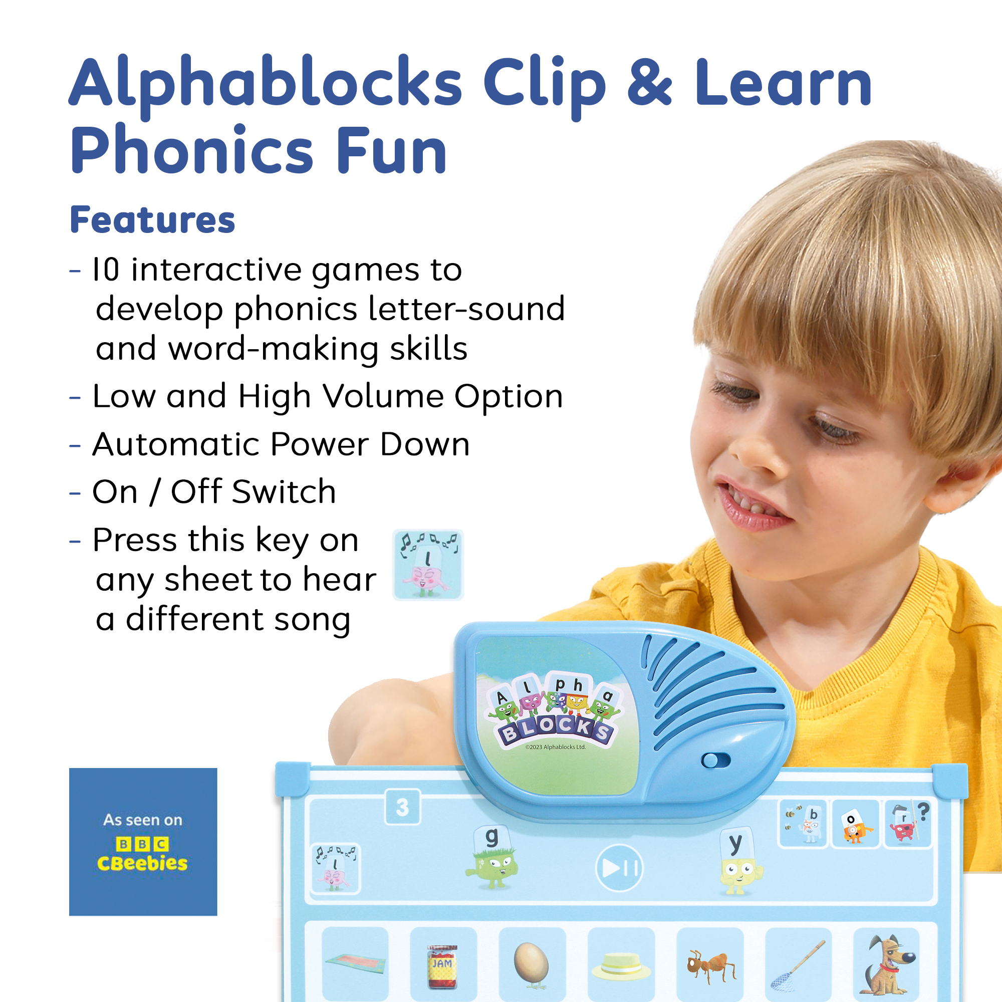 Getting started is simple: insert a play sheet, select a game using the Game Button and meet the Alphablocks. Each sheet introduces different activities; from identifying letters and sounds to spotting vowels and building words, keeping learning fresh, varied and motivating. As each activity is mastered, learners can move on to the next at the touch of a button.