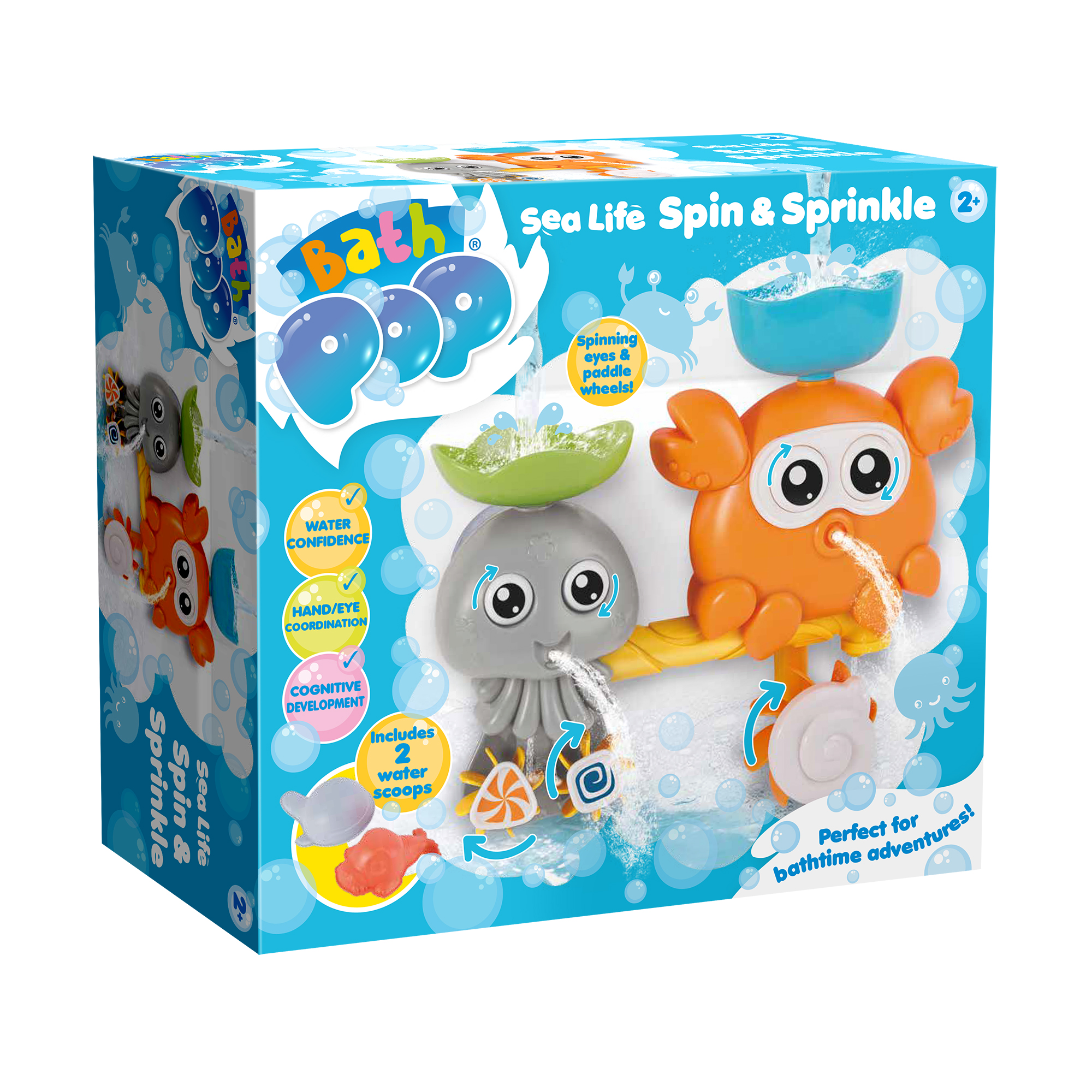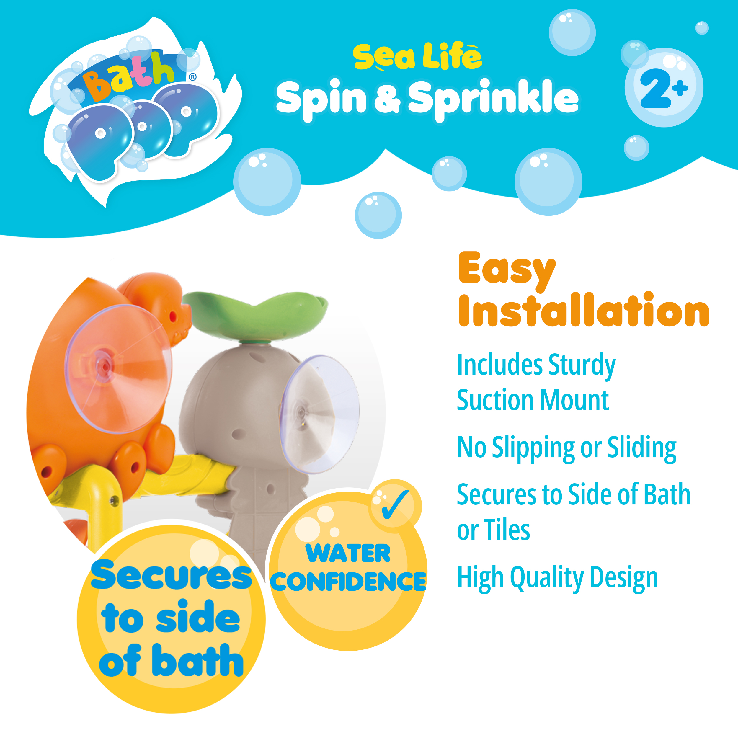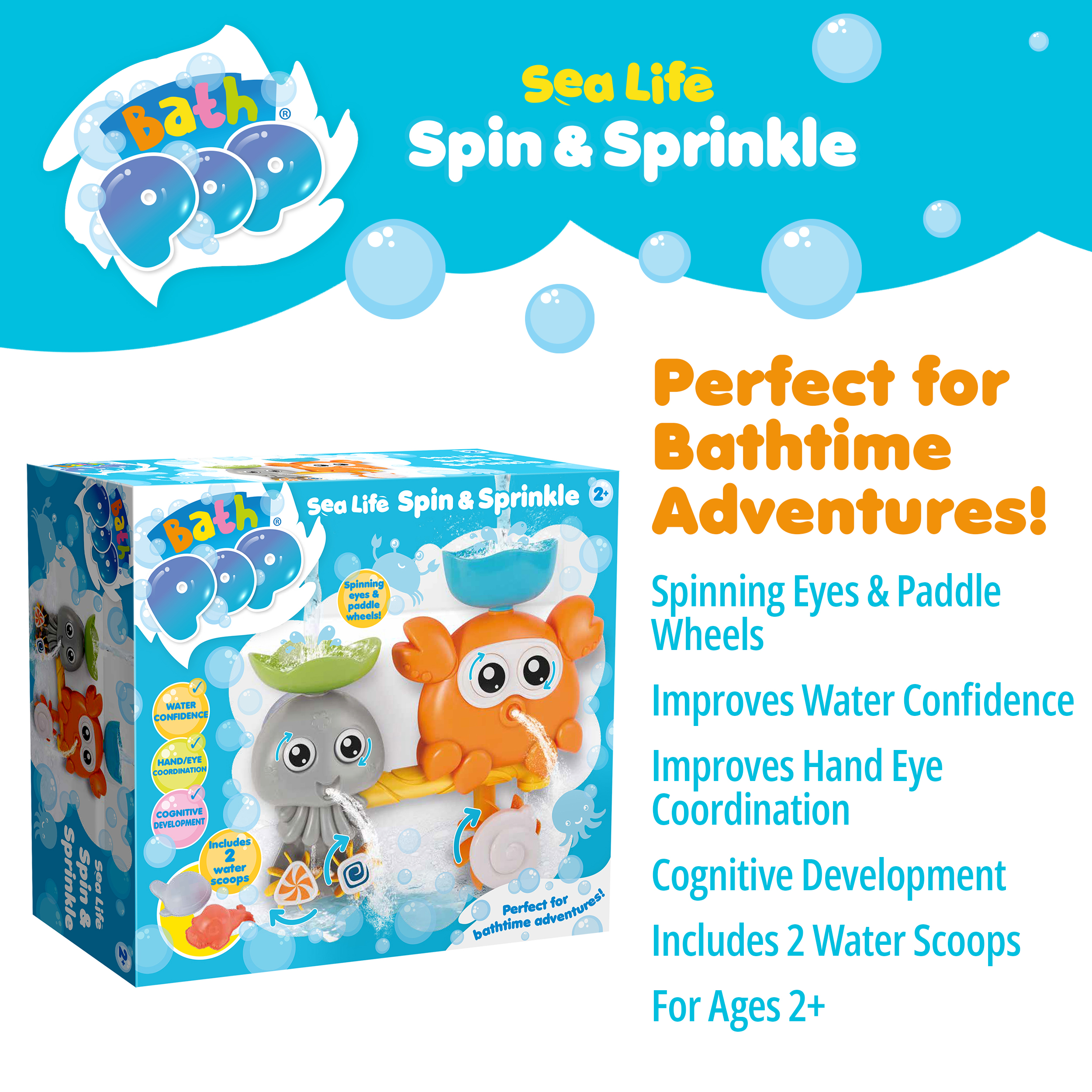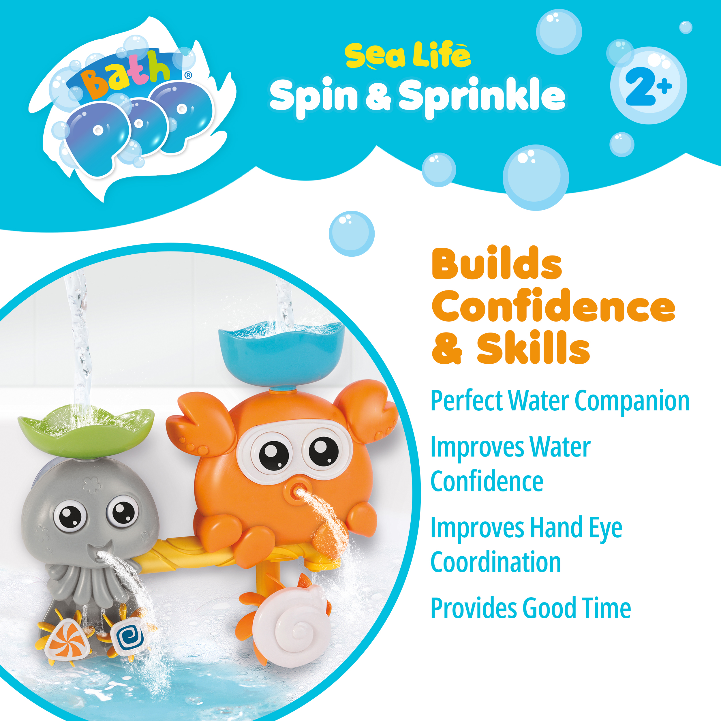 Make bathtime an underwater adventure with the Bath Pop Spin and Sprinkle set. Bright, colourful and full of interactive features, this sea‑life themed toy sticks easily to the bath or tiles, bringing playful characters to life with every splash.