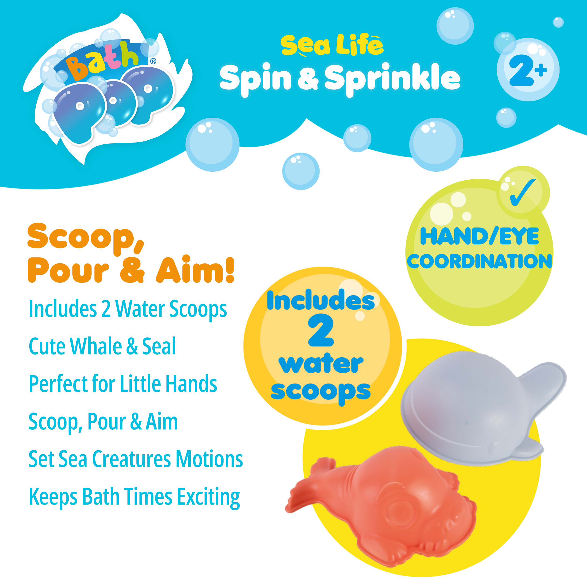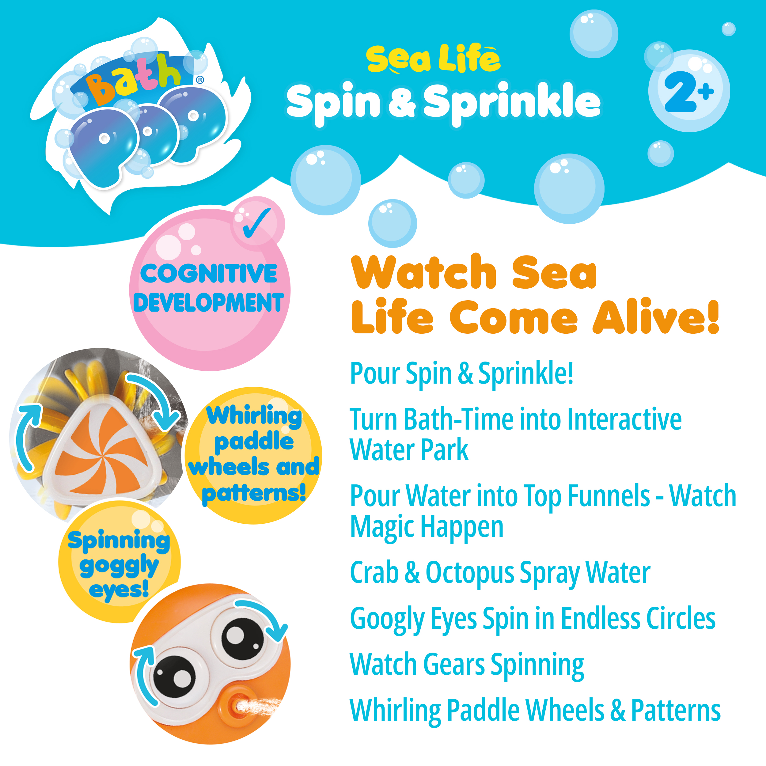 Little ones can scoop and pour water using the baby seal and whale scoops, then watch the magic unfold. Water flows through wavy funnels, sprinkling from the crab and octopus mouths while their goggly eyes spin with excitement. Three whizzing cogs create unique patterns and movements with every pour, keeping play fresh, surprising and endlessly engaging.