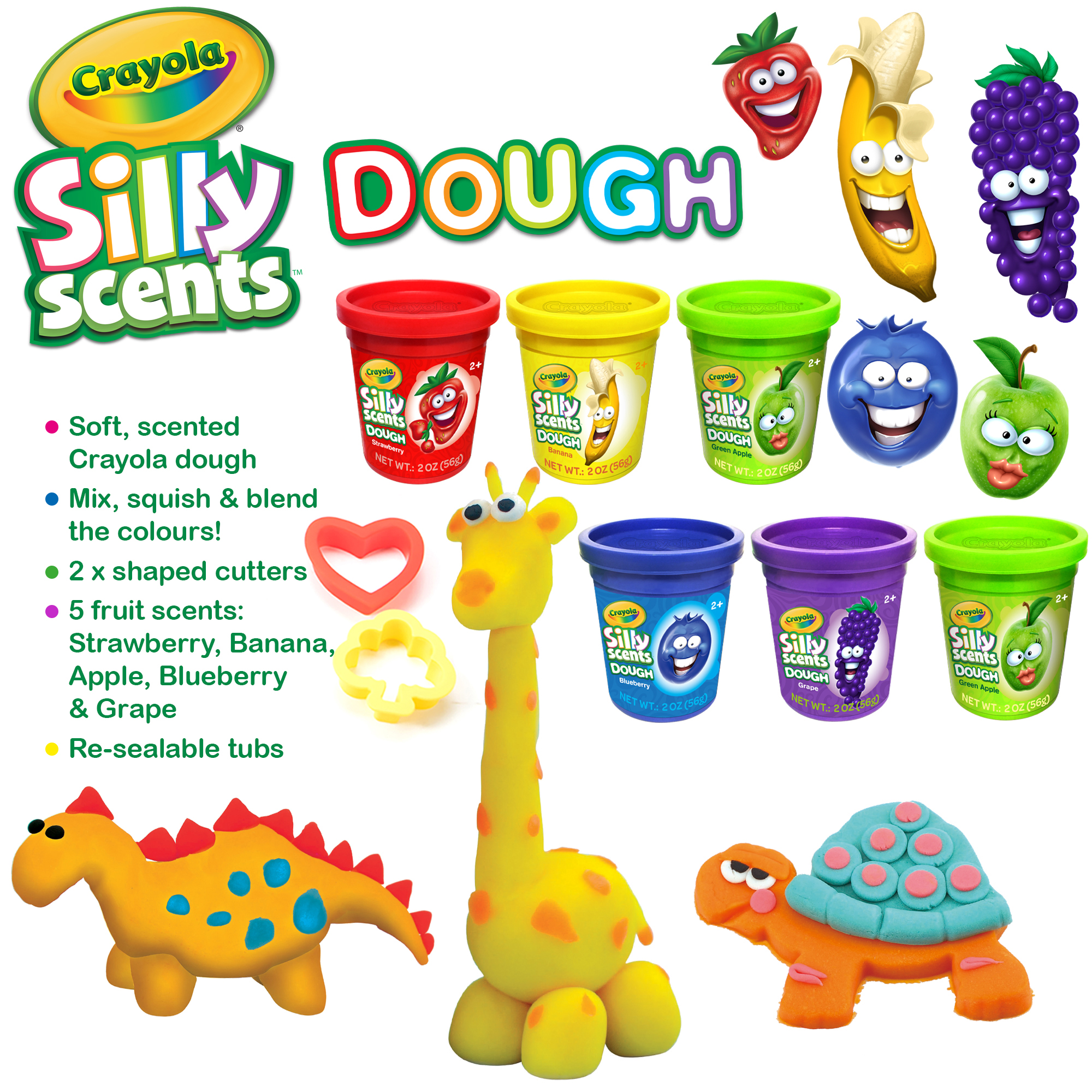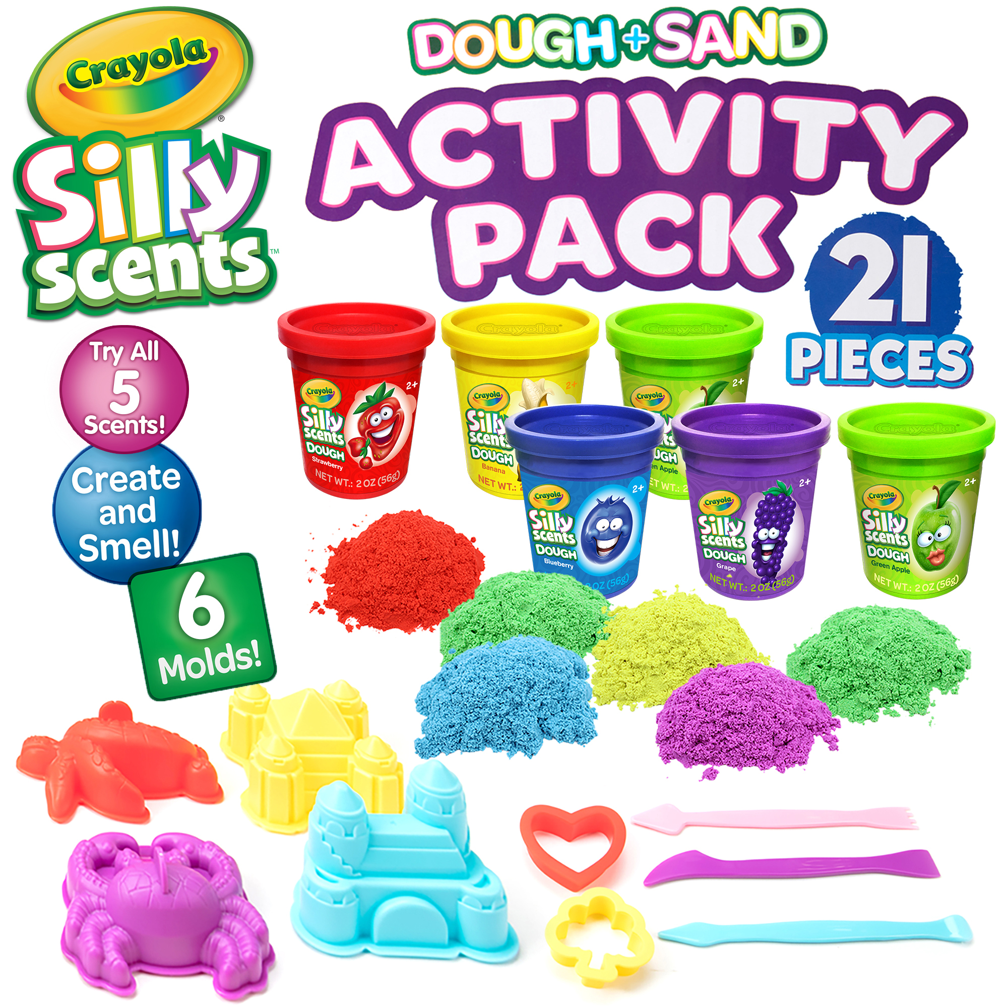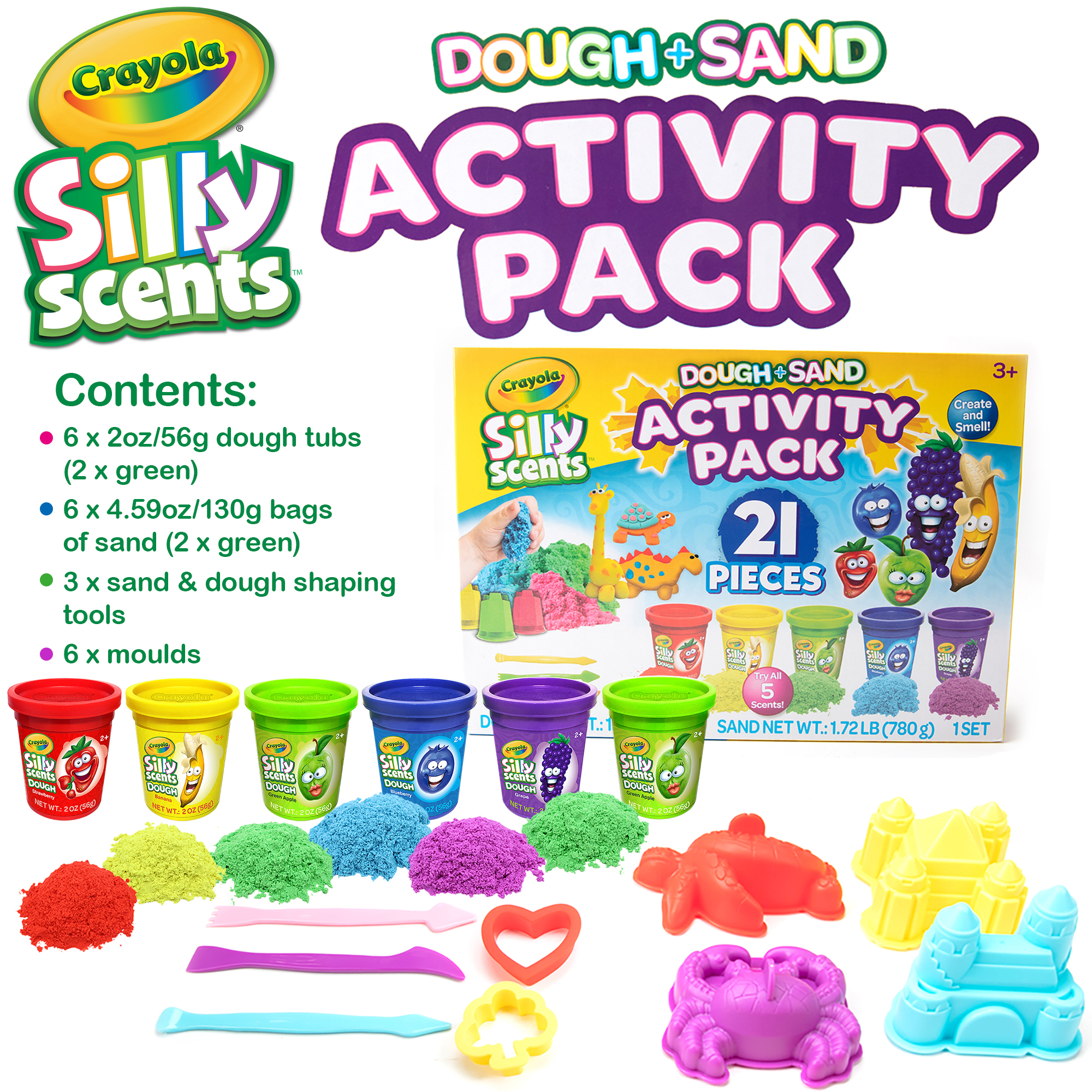 The set includes six 2oz (56g) dough tubs and six 4.59oz (130g) sand tubs, each infused with fruity Silly Scents fragrances. With colours and scents such as Green/Apple, Red/Strawberry, Blue/Blueberry, Purple/Grape and Yellow/Banana, every creation looks, feels and smells exciting.