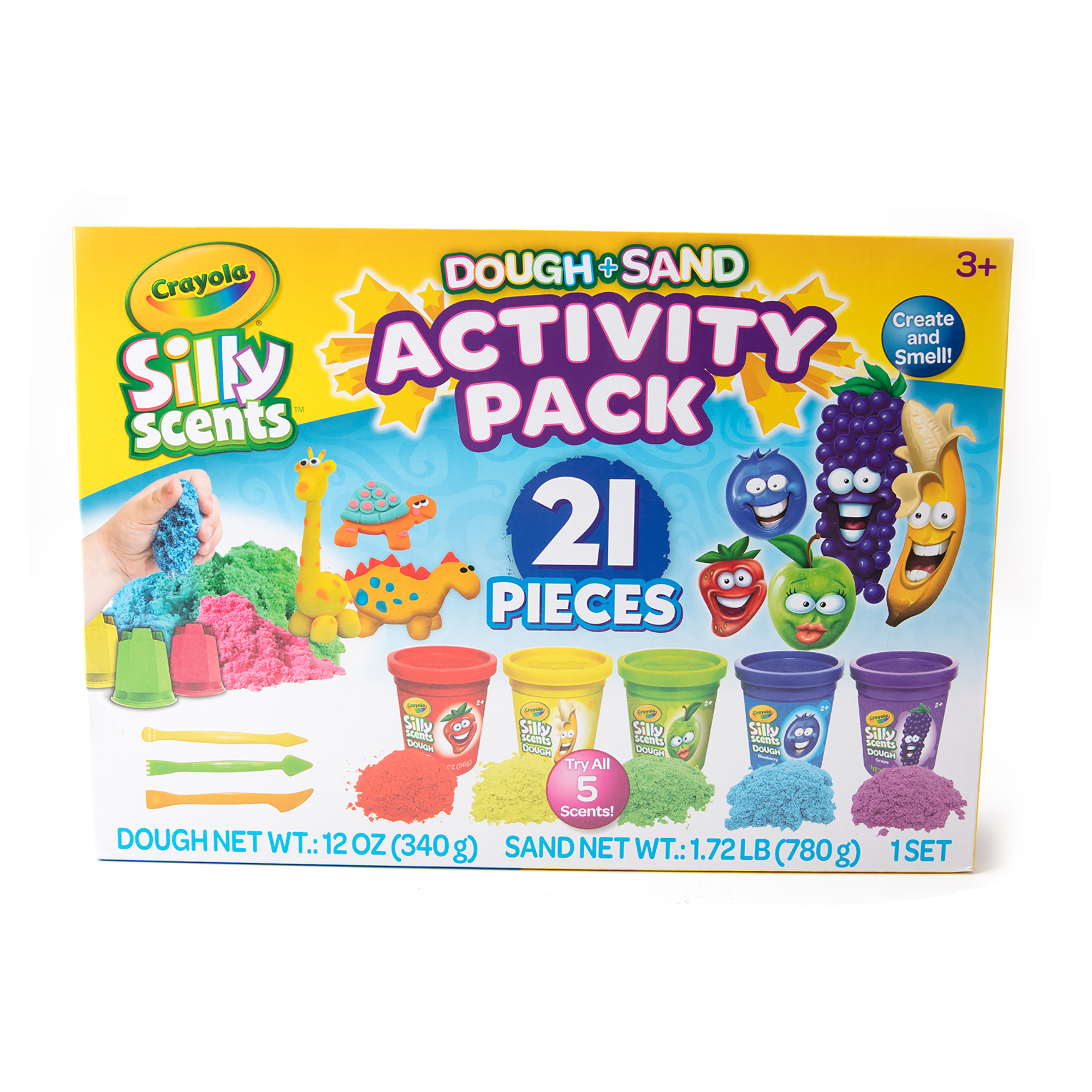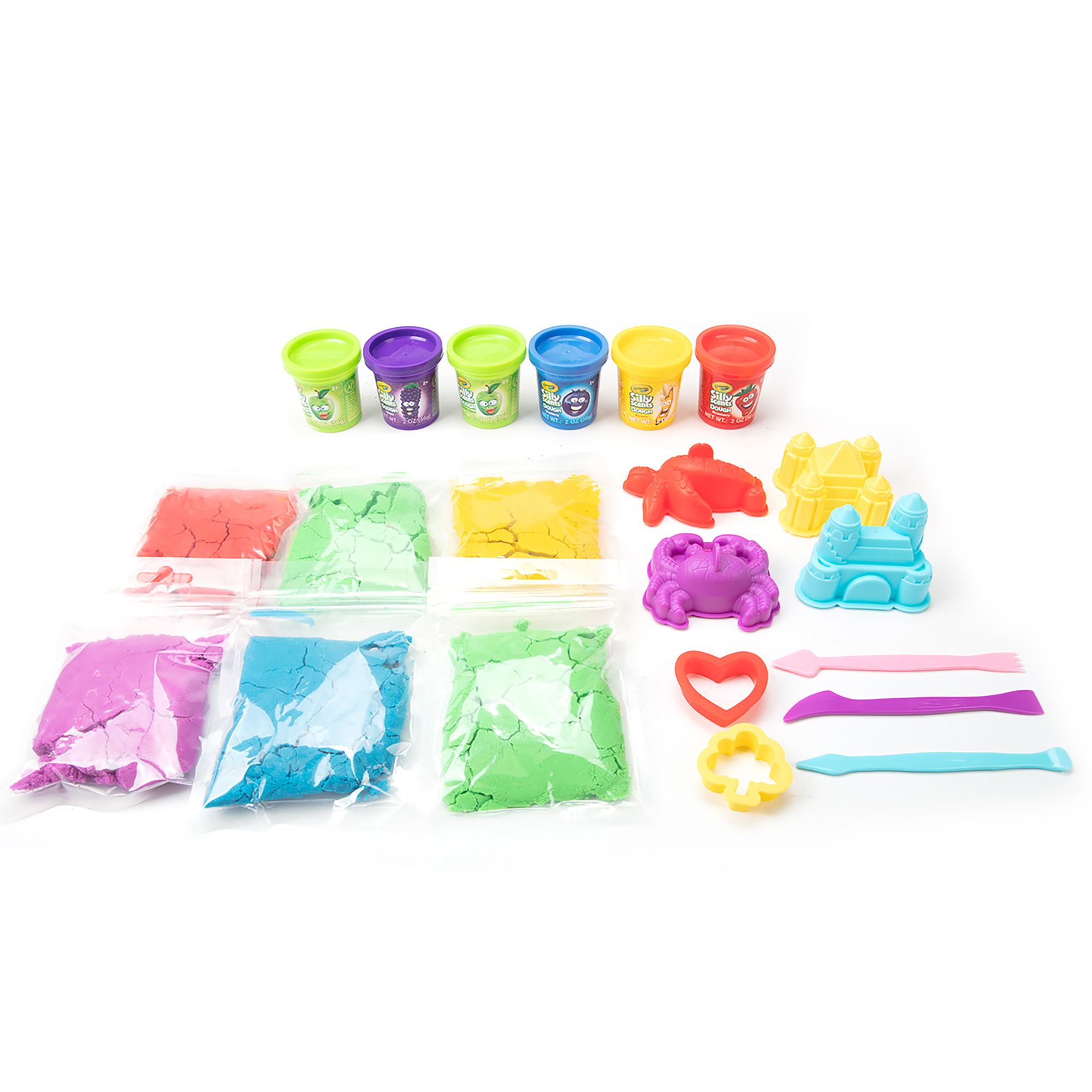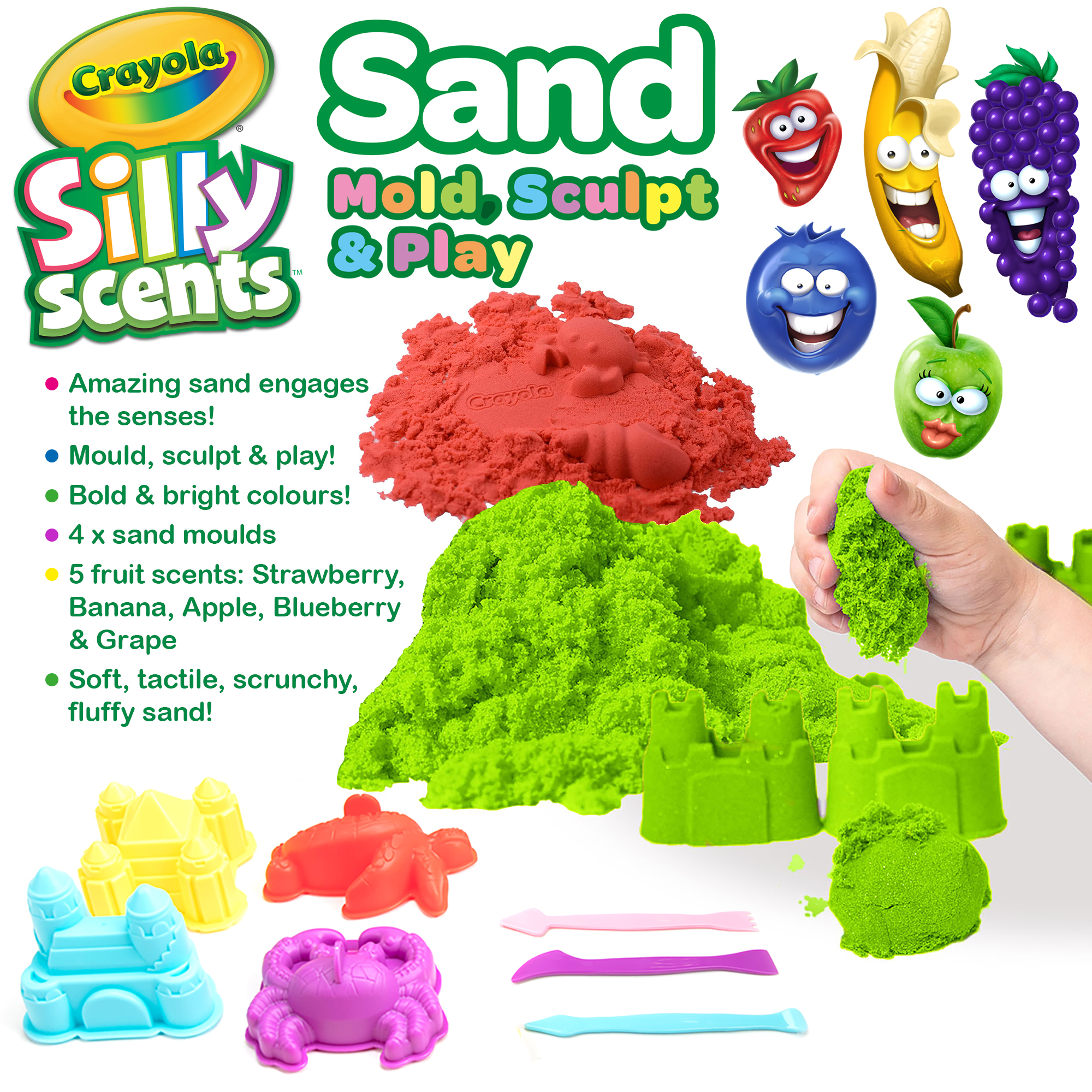 The set includes six 2oz (56g) dough tubs and six 4.59oz (130g) sand tubs, each infused with fruity Silly Scents fragrances. With colours and scents such as Green/Apple, Red/Strawberry, Blue/Blueberry, Purple/Grape and Yellow/Banana, every creation looks, feels and smells exciting.