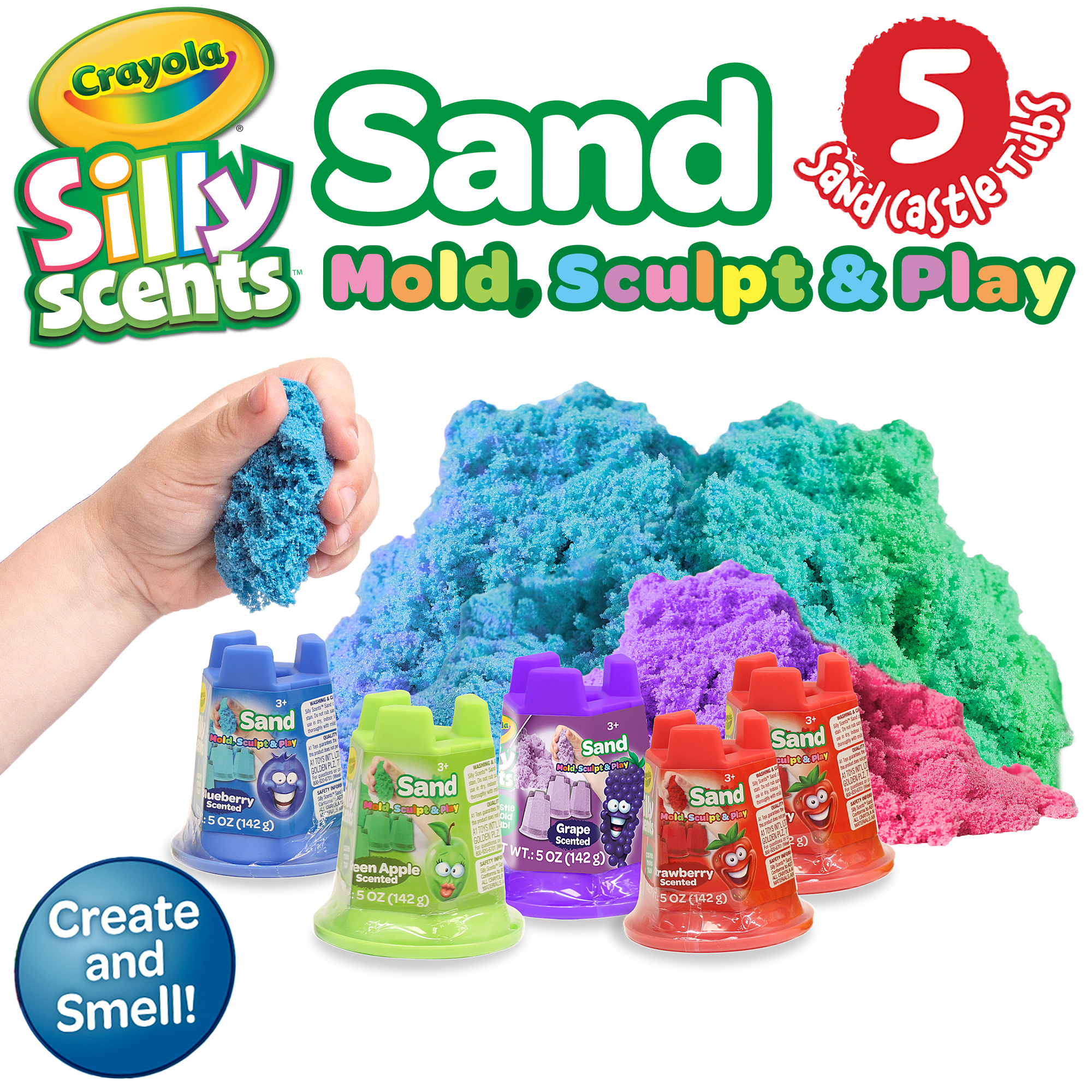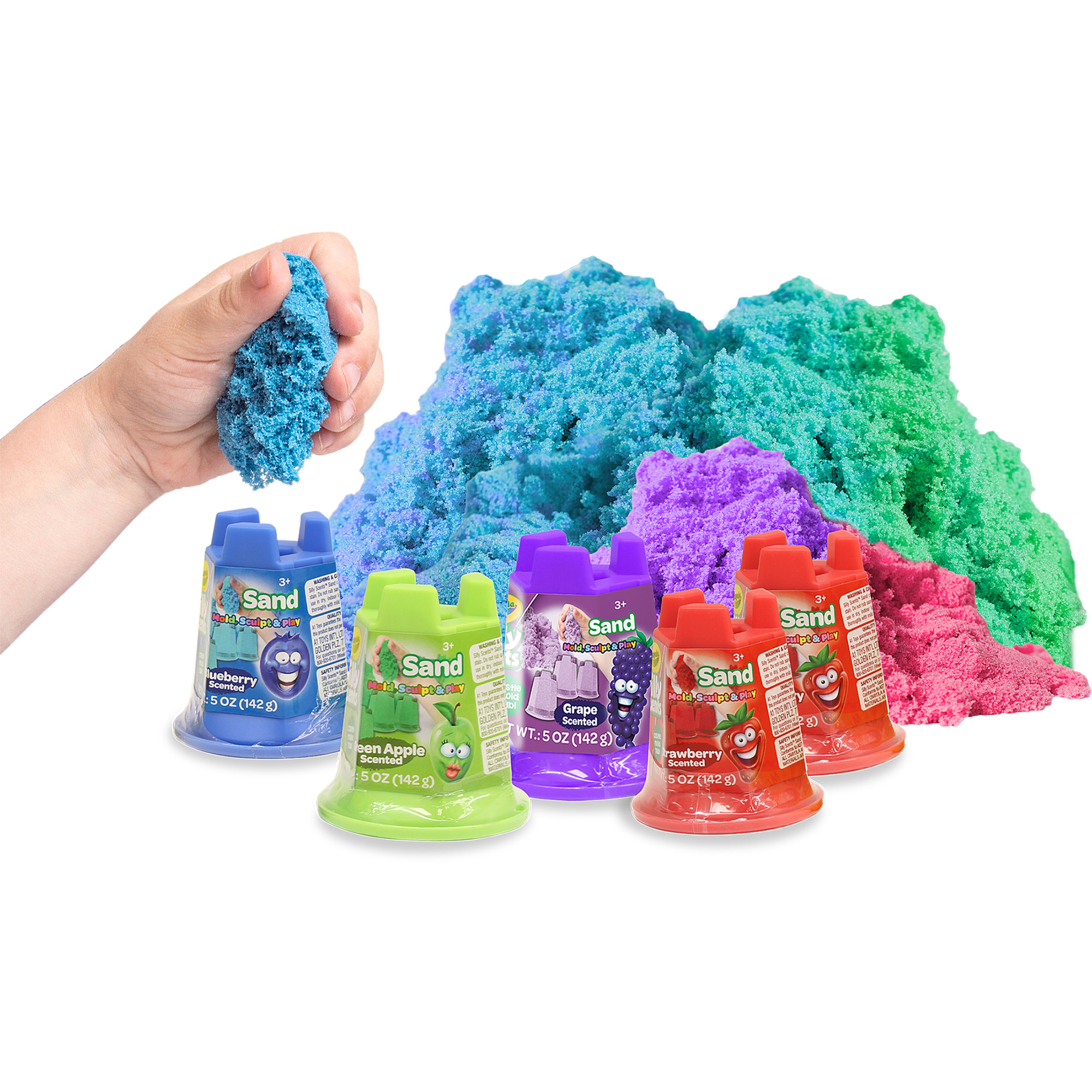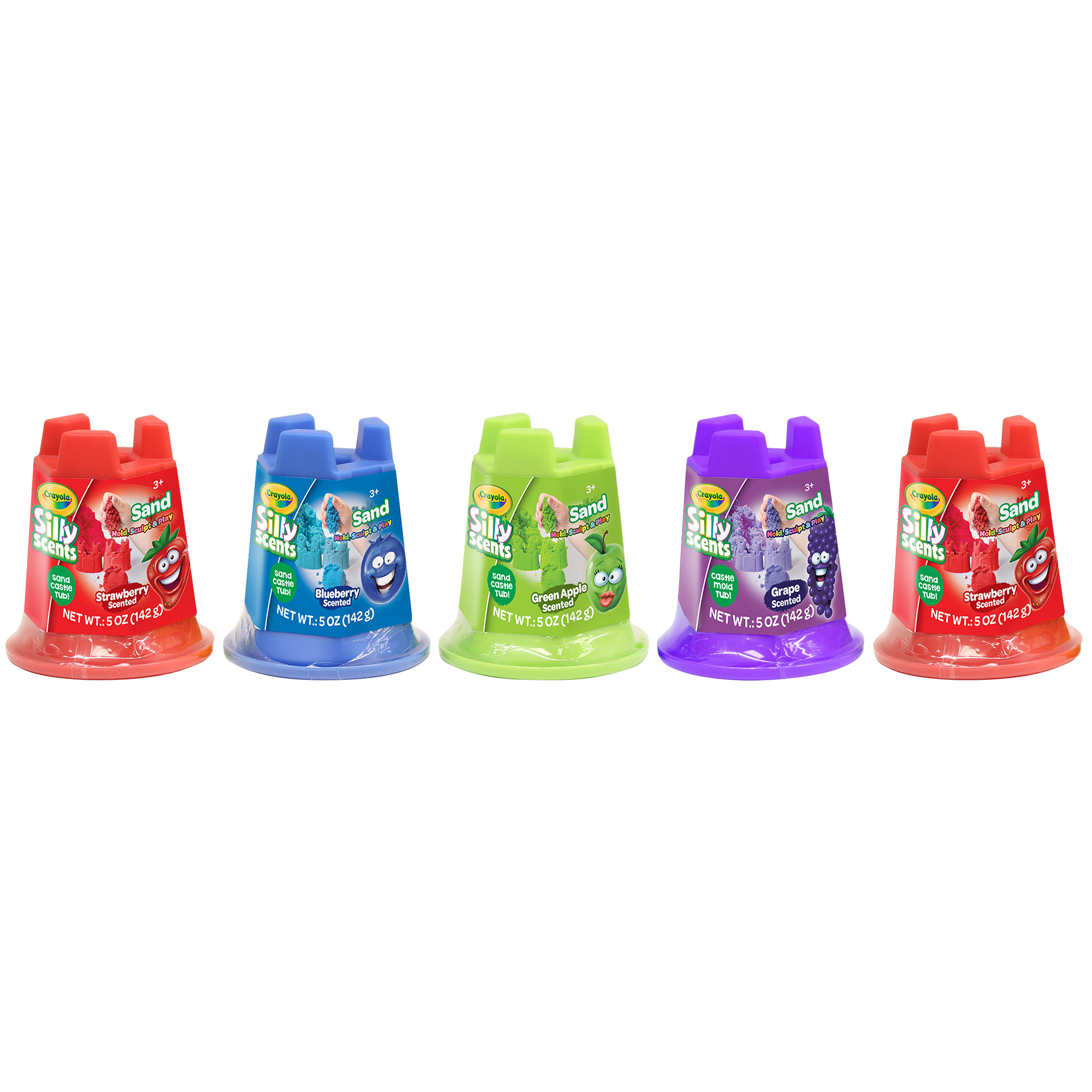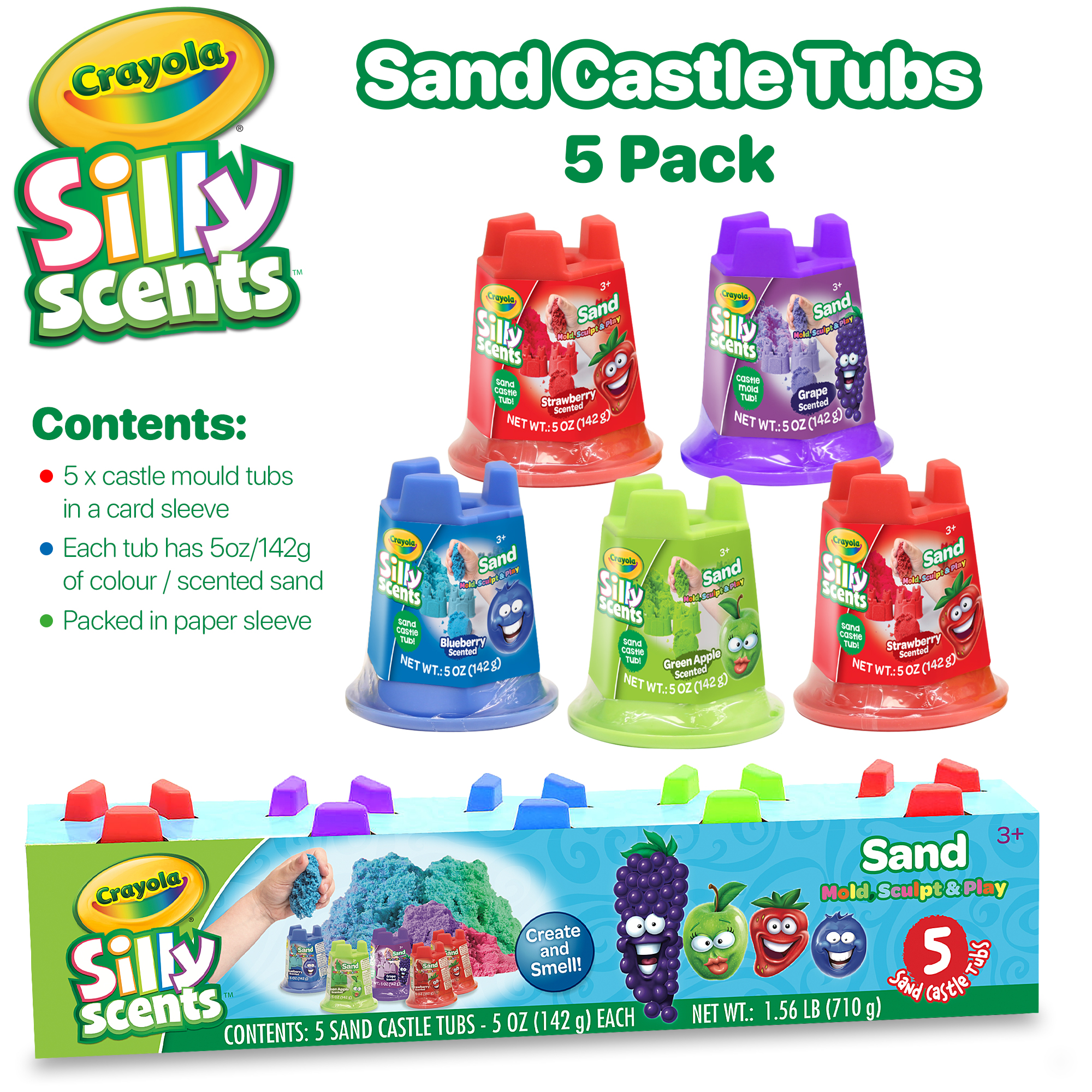 Each pack includes five 5oz (142g) castle‑mould tubs, filled with soft, scrunchy and fluffy Silly Scents sand. The bright, fruity‑scented colours include: 2 x Red/Strawberry, 1 x Green/Apple, 1 x Blue/Blueberry and 1 x Purple/Grape.