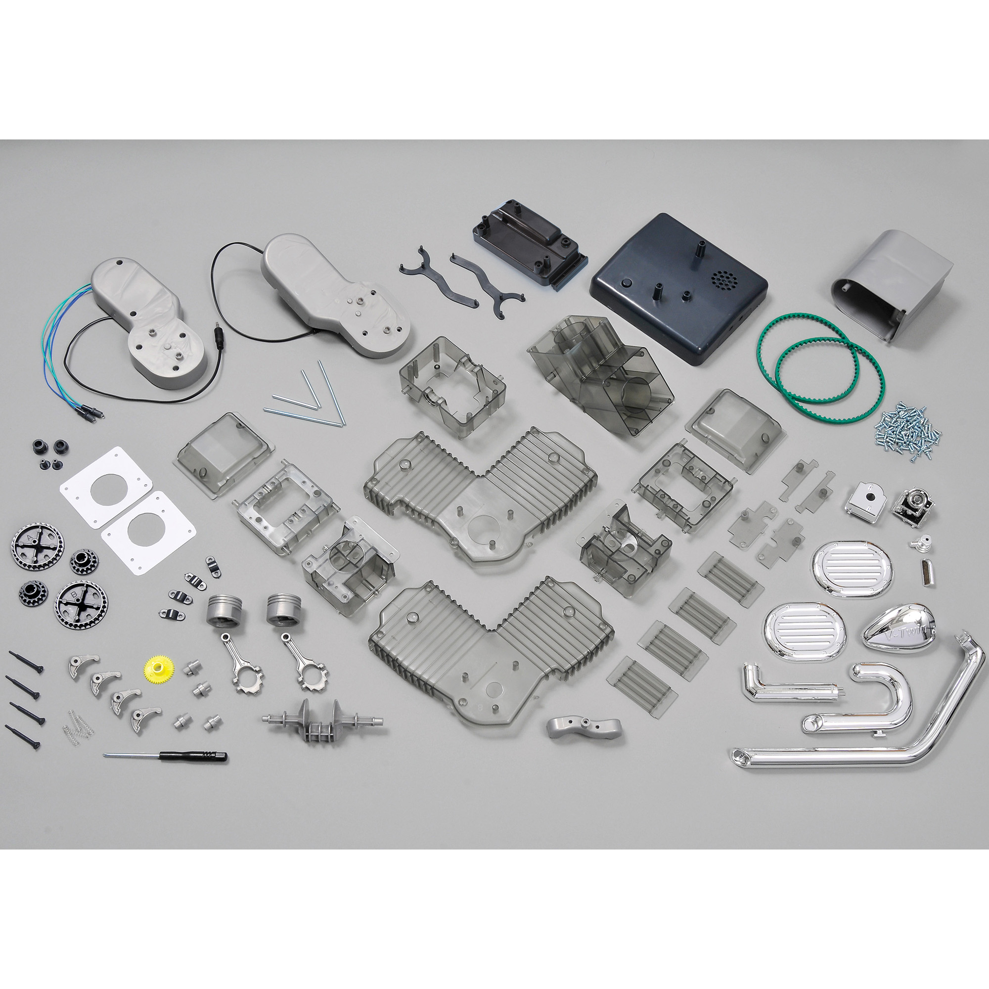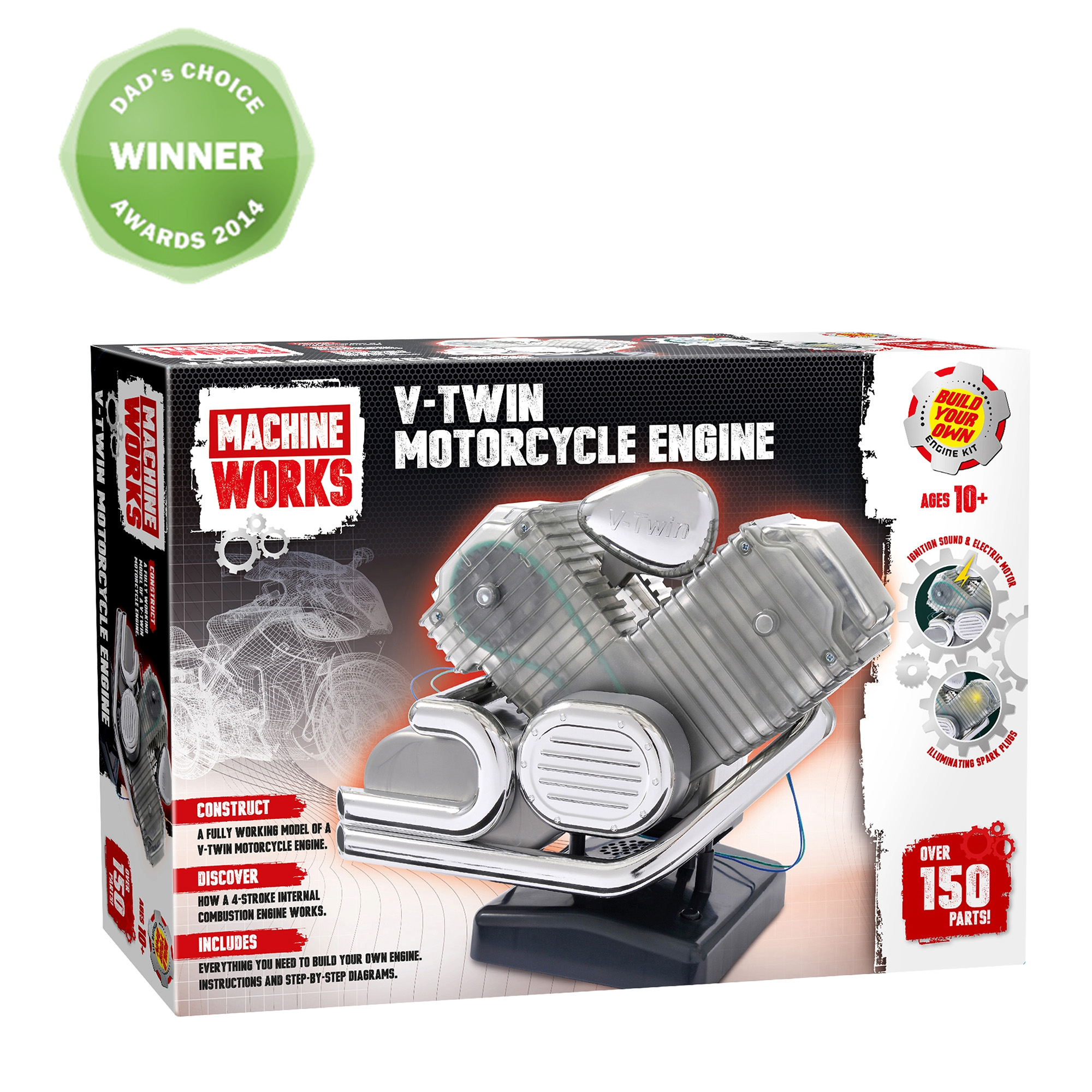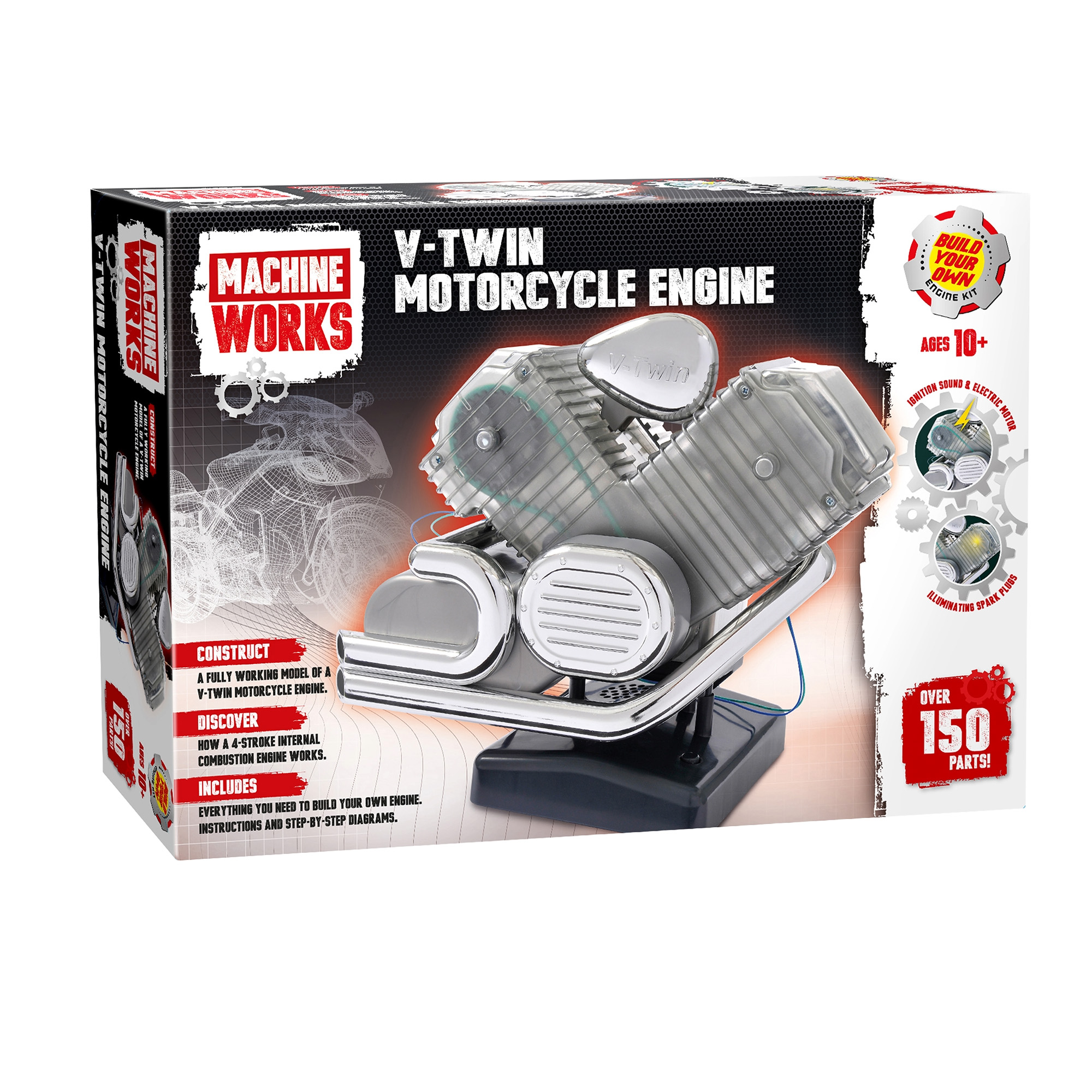 The Machine Works Build Your Own V‑Twin Motorcycle Engine Kit offers an engaging look at the mechanics of an iconic motorcycle engine. A transparent casing showcases coordinated piston, valve, and crankshaft movement, enhanced by illuminated spark plugs. With over 150 components and step‑by‑step instructions, the build delivers a rewarding hands‑on experience. Once assembled, the model becomes a detailed display piece.