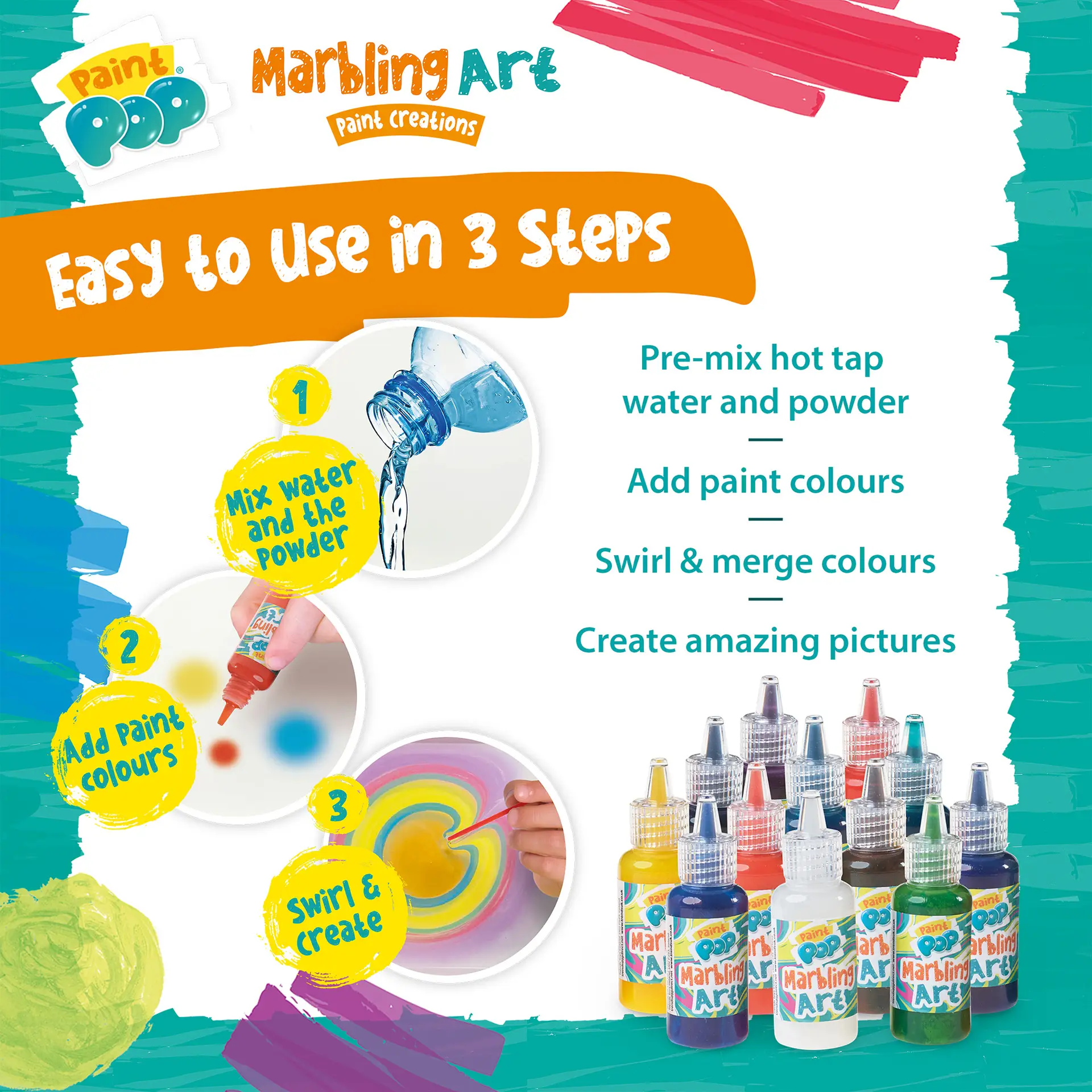 Turn imagination into mesmerising masterpieces with the Paint Pop Marbling Art Craft Kit. Inspired by a centuries‑old art form, this hands‑on activity lets young creators explore swirling patterns, floating colours and magical marbled effects with beautifully unique results every time.