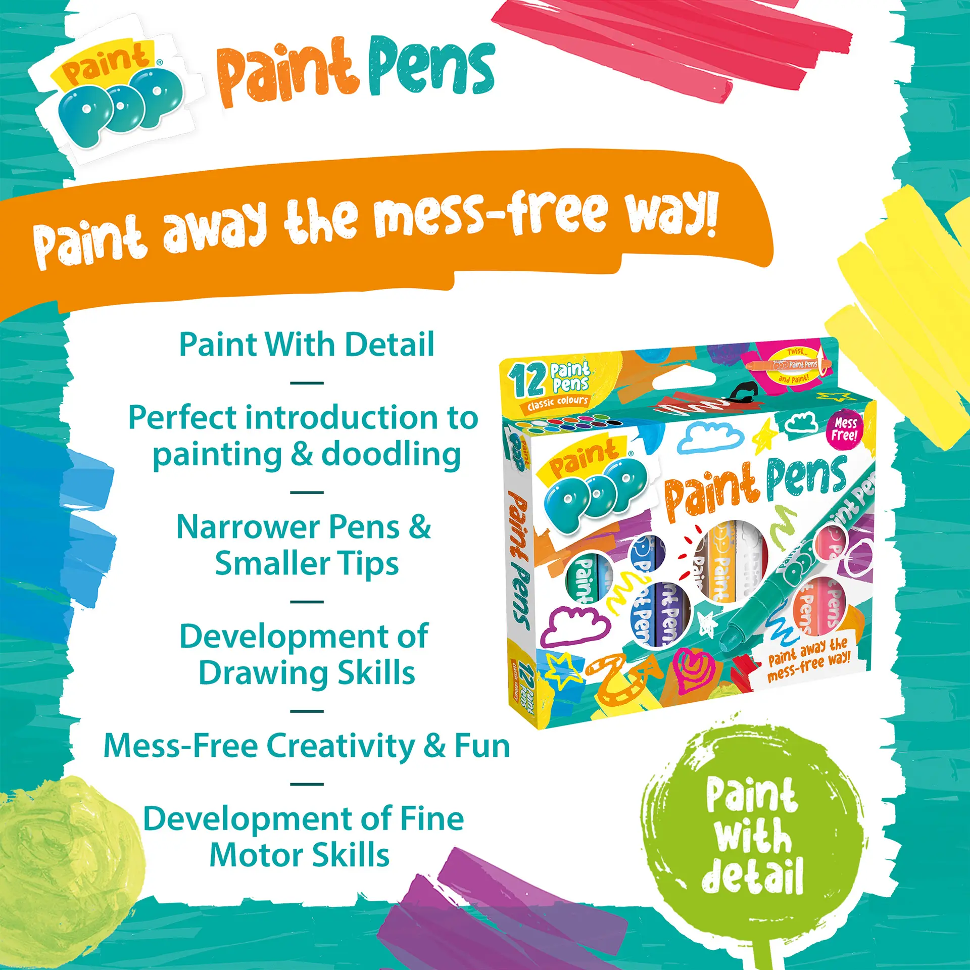 Bring creativity to life the mess‑free way with the Paint Pop Paint Pens 12 Pack, the perfect introduction to painting, colouring and doodling. Designed with narrower barrels and fine paint tips, these pens help young artists add detail to their creations while supporting early drawing skills and fine motor development.
