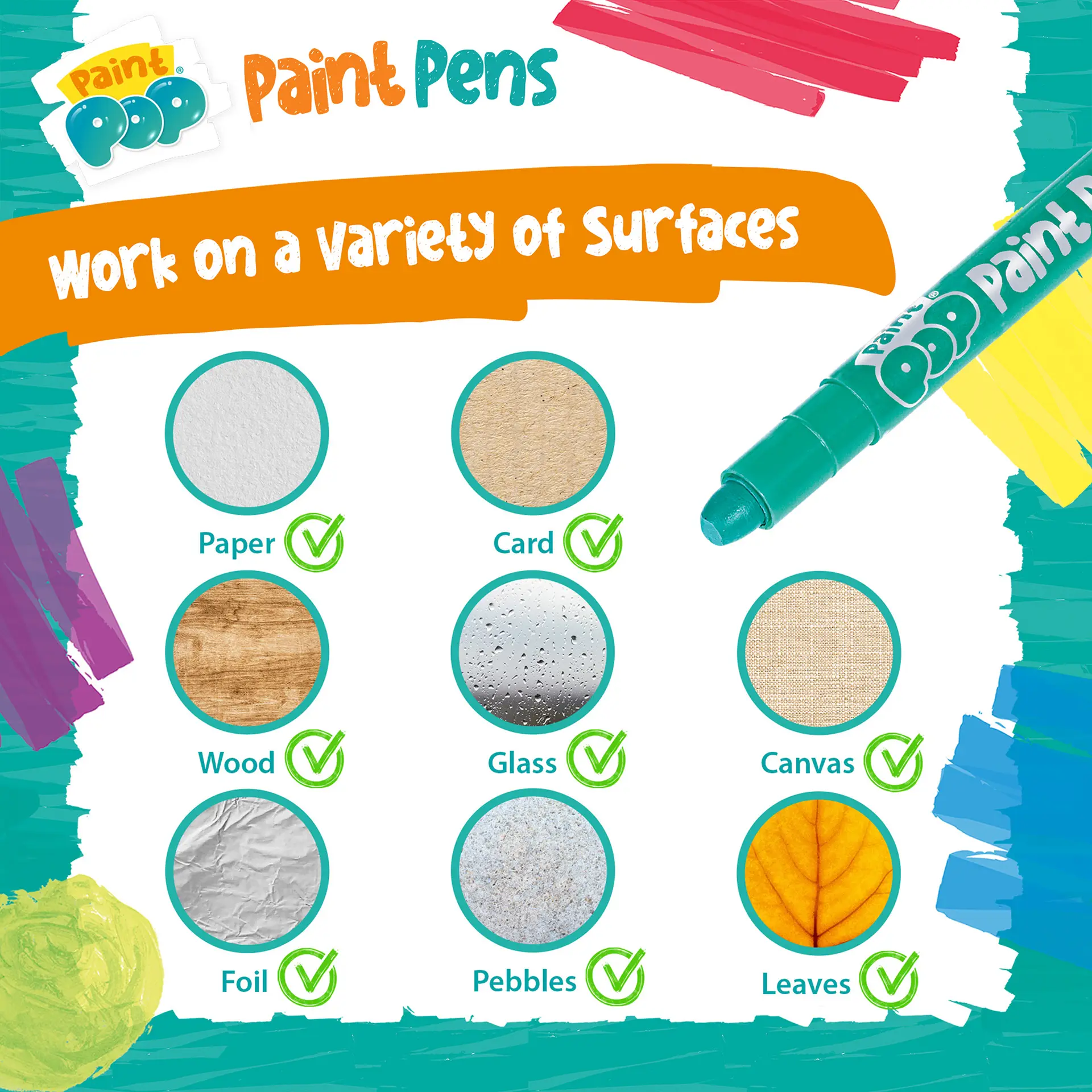 This colourful set includes 12 bright, vibrant, water‑soluble and non‑toxic paints, safe for children and packed with creative possibilities. Paint Pop Paint Pens work beautifully on a wide range of surfaces including paper, card, canvas, wood, glass, foil, leaves and even pebbles. On non‑porous surfaces such as glass or whiteboards, artwork wipes away effortlessly with a damp cloth.