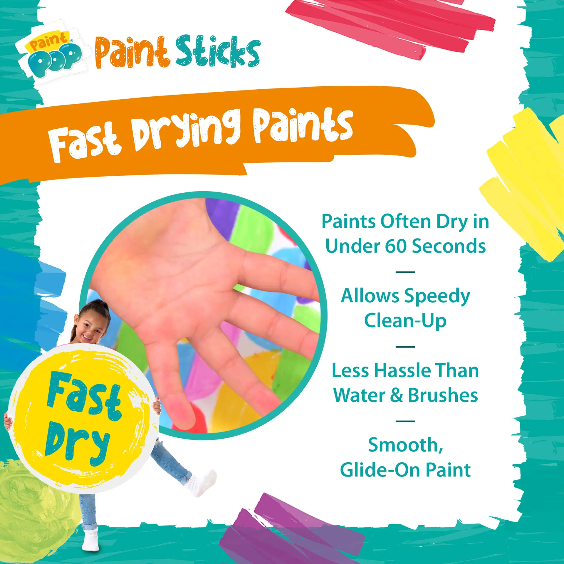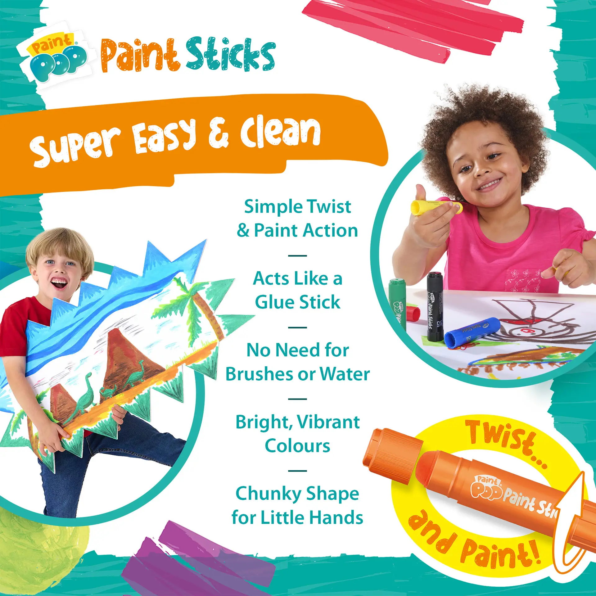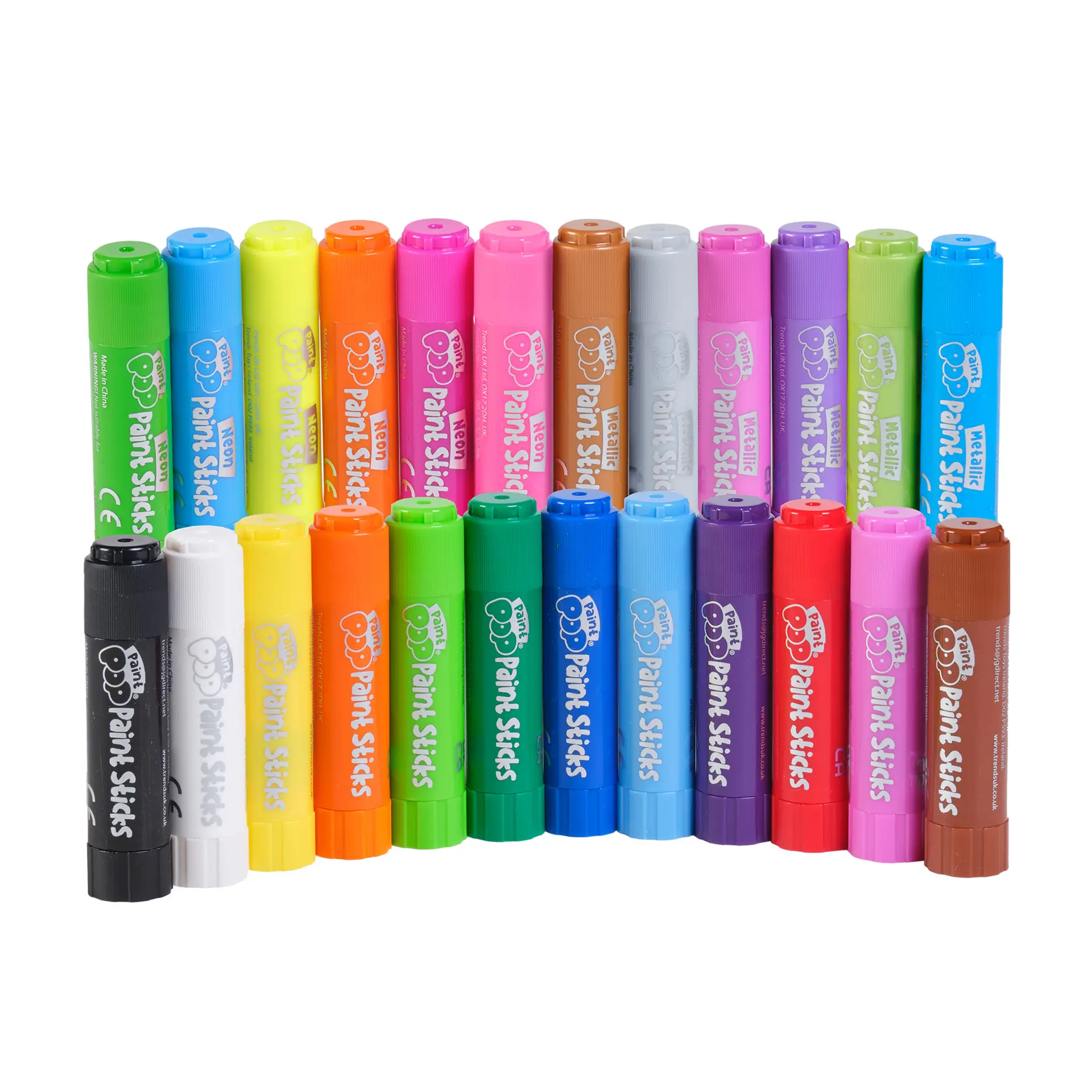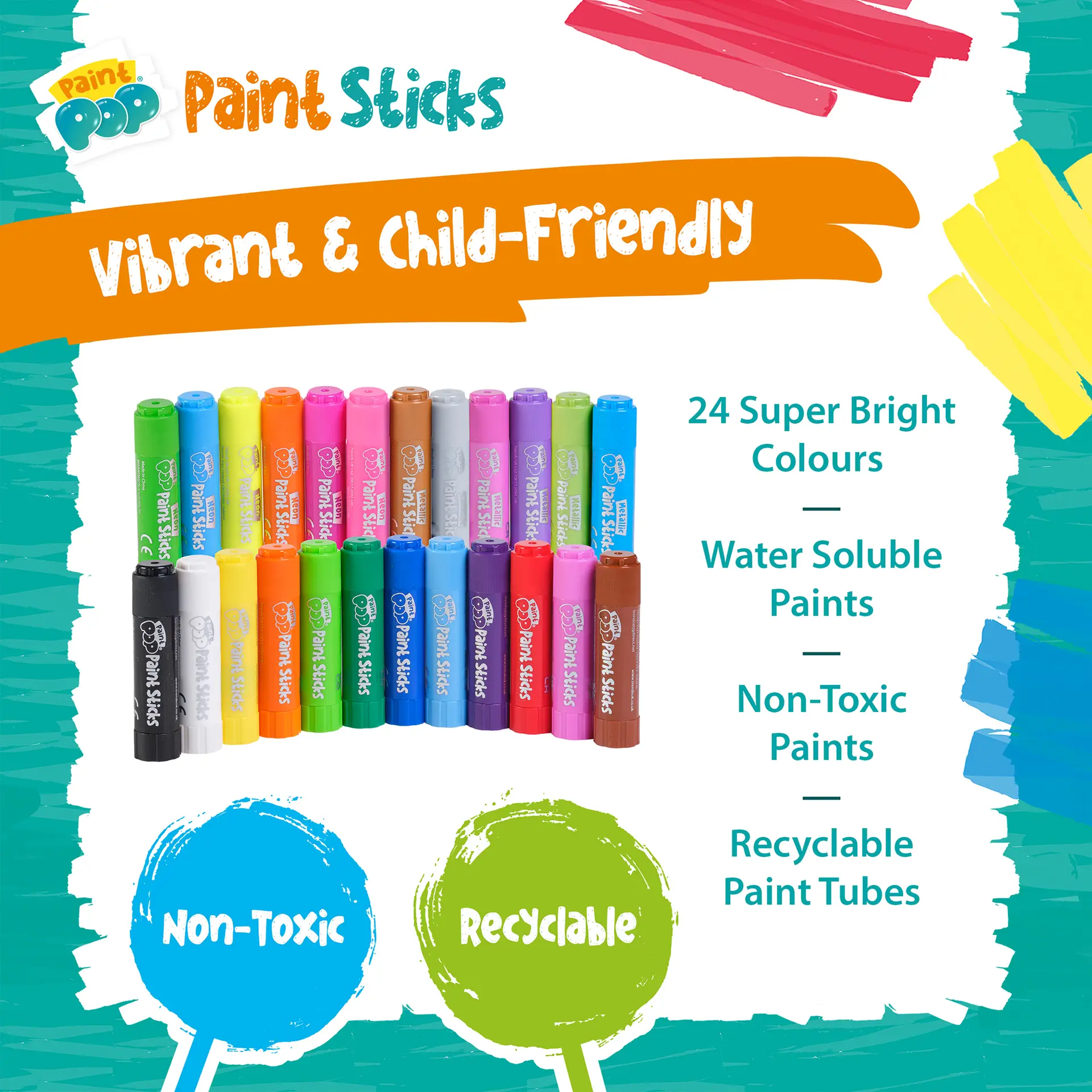Each pack includes super‑bright, vibrant, water‑soluble and non‑toxic colours, ideal for safe creative play. Paint Pop Paint Sticks work beautifully on a wide range of surfaces including paper, card, canvas, wood and glass. Paint can be wiped from non‑porous surfaces with a damp cloth, making them perfect for home, school or on‑the‑go creativity.