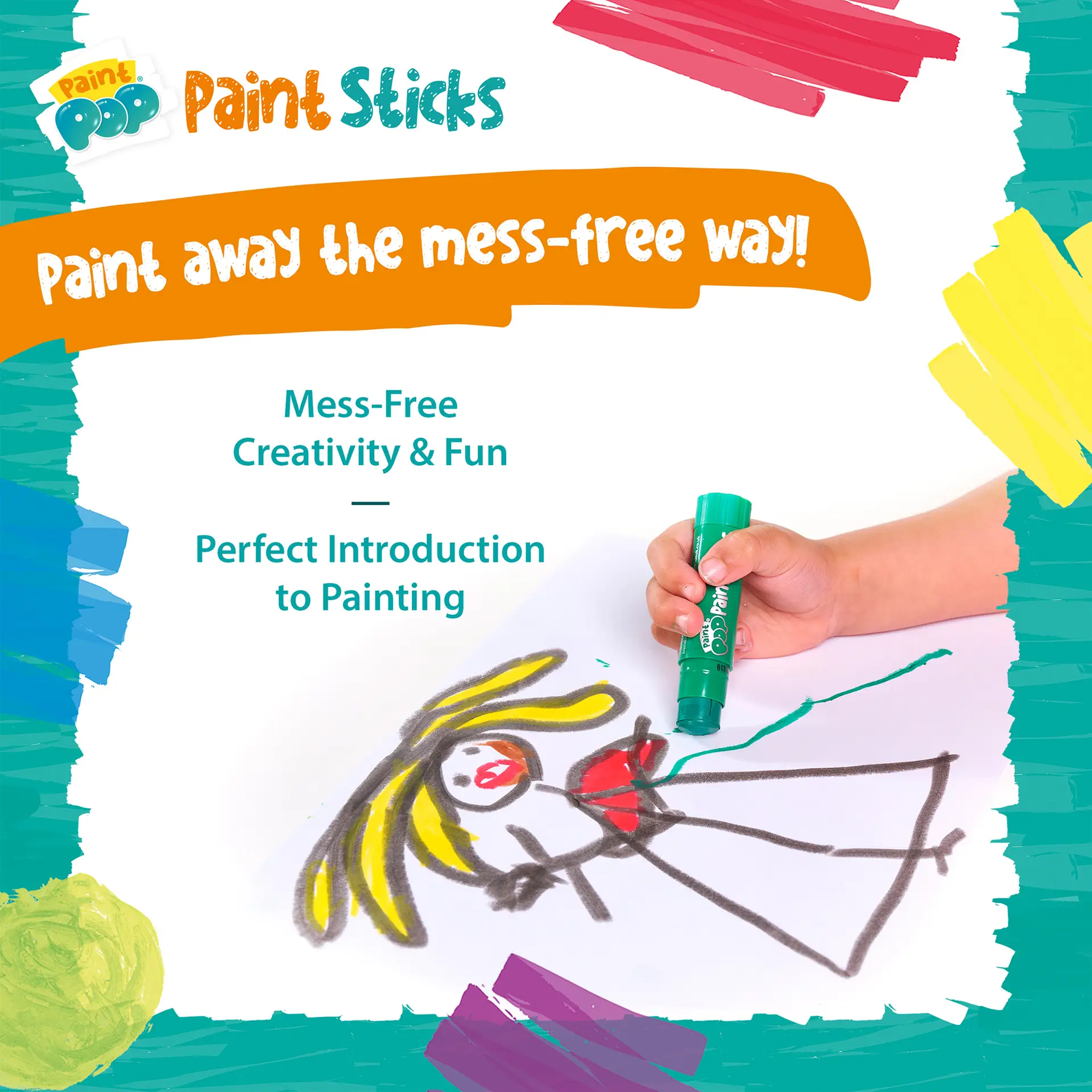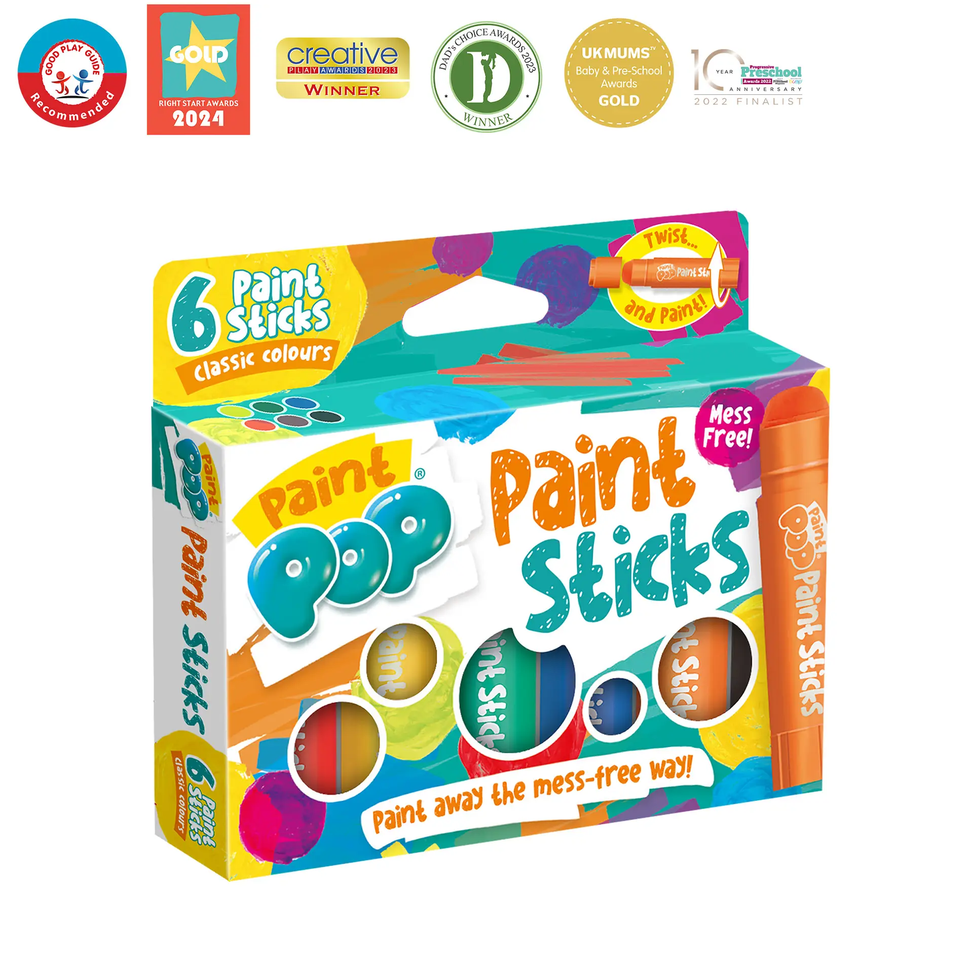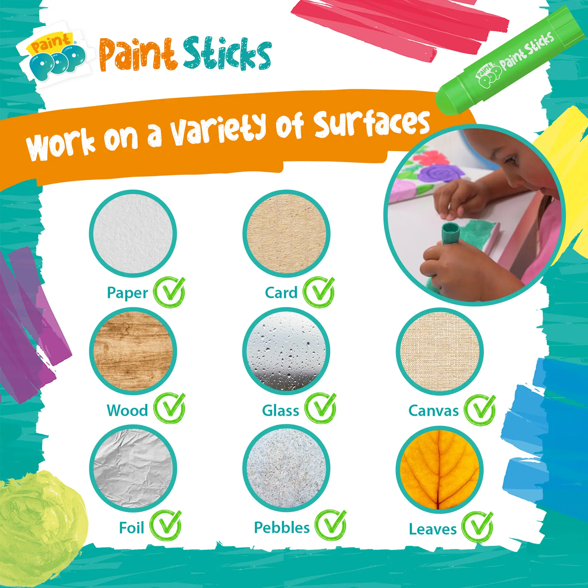 Each pack includes super‑bright, vibrant, water‑soluble and non‑toxic colours, ideal for safe creative play. Paint Pop Paint Sticks work beautifully on a wide range of surfaces including paper, card, canvas, wood and glass. Paint can be wiped from non‑porous surfaces with a damp cloth, making them perfect for home, school or on‑the‑go creativity.