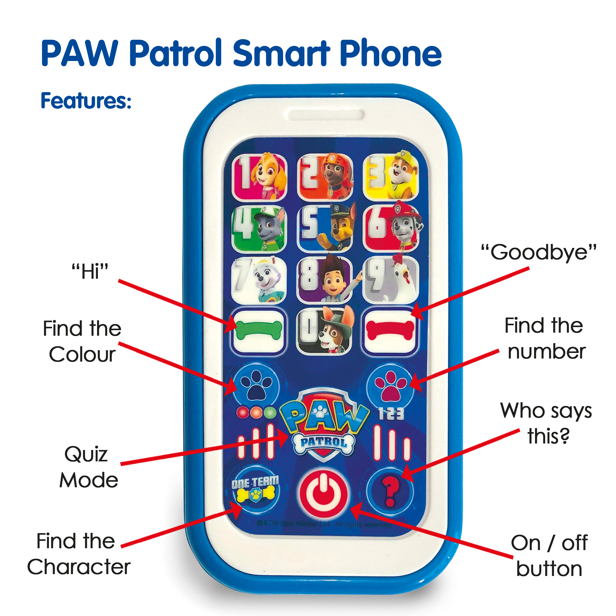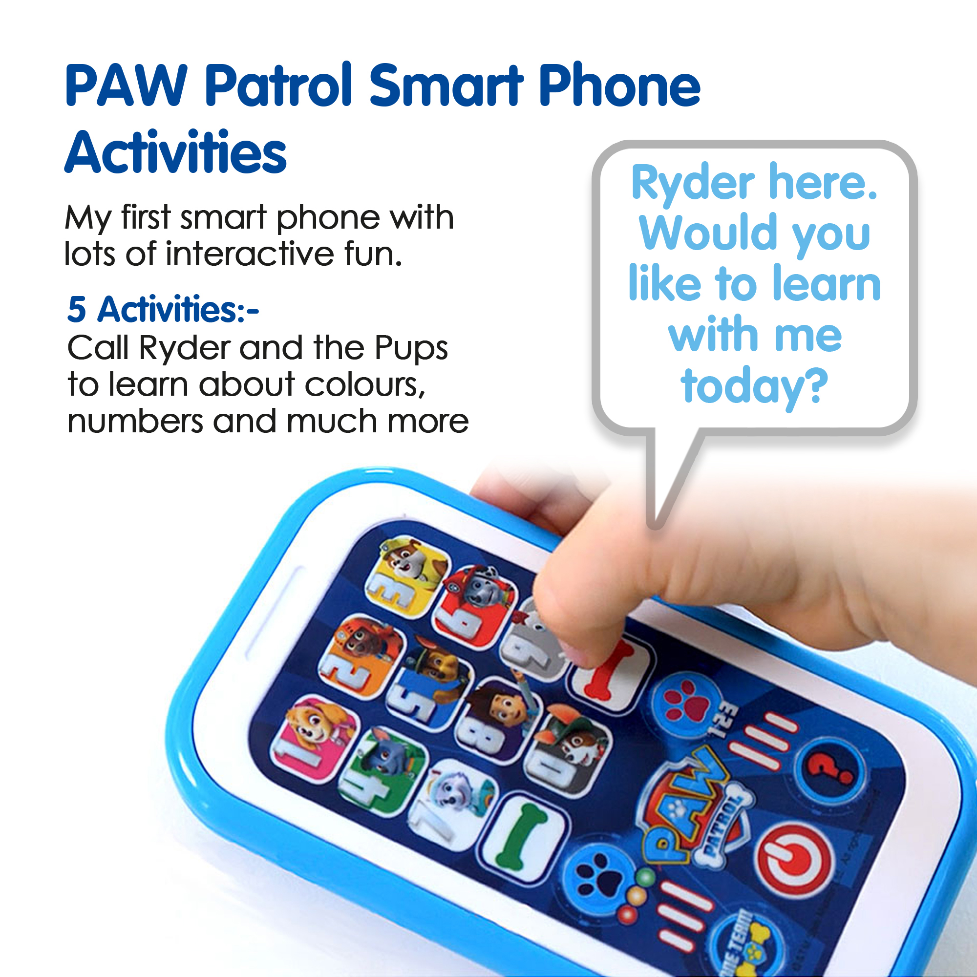 The phone includes four playful activities, such as calling up to ten different characters, finding the correct pup, colour or number, and a quiz mode that reinforces newly learned skills. Bold graphics and large, easy‑press buttons make independent exploration simple and enjoyable.