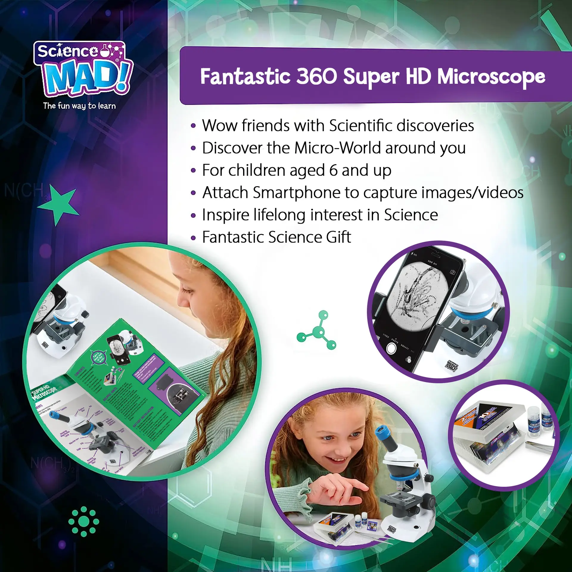 Designed for ages 6 and up (with adult supervision), the Science Mad 360° Super HD Microscope encourages STEM learning, observation skills and scientific curiosity. It’s an ideal gift for budding naturalists and young explorers ready to investigate the microscopic world in stunning HD detail.
