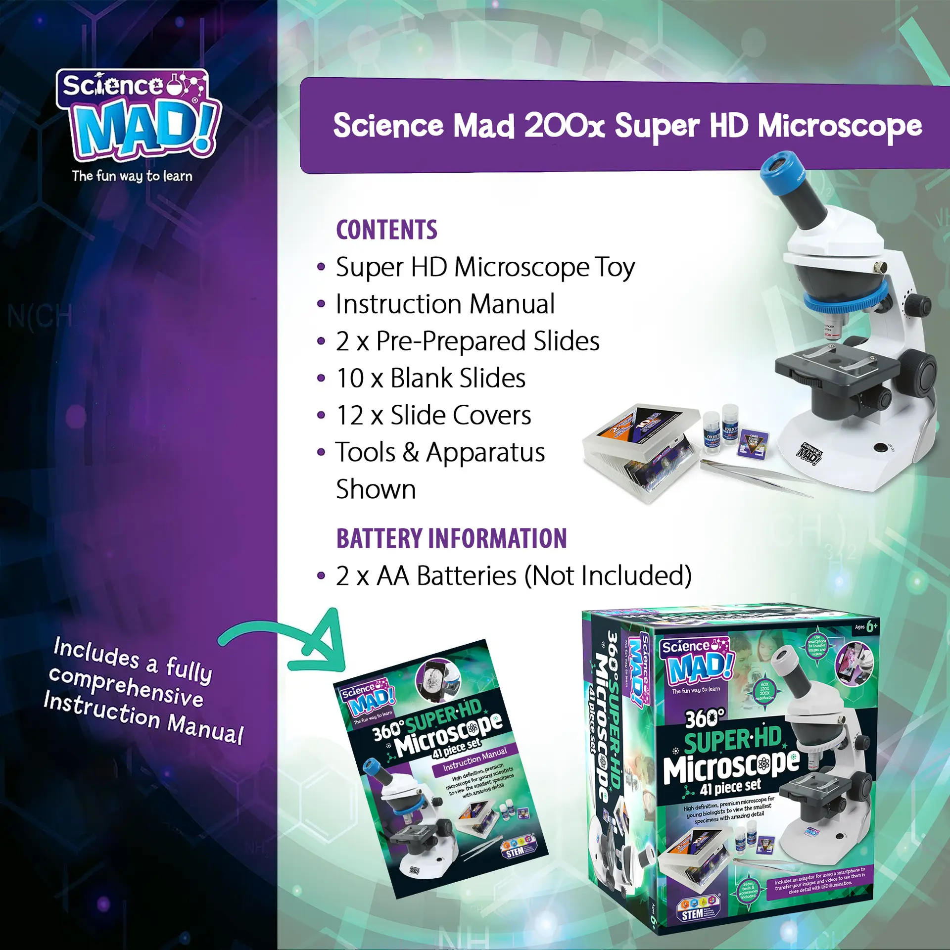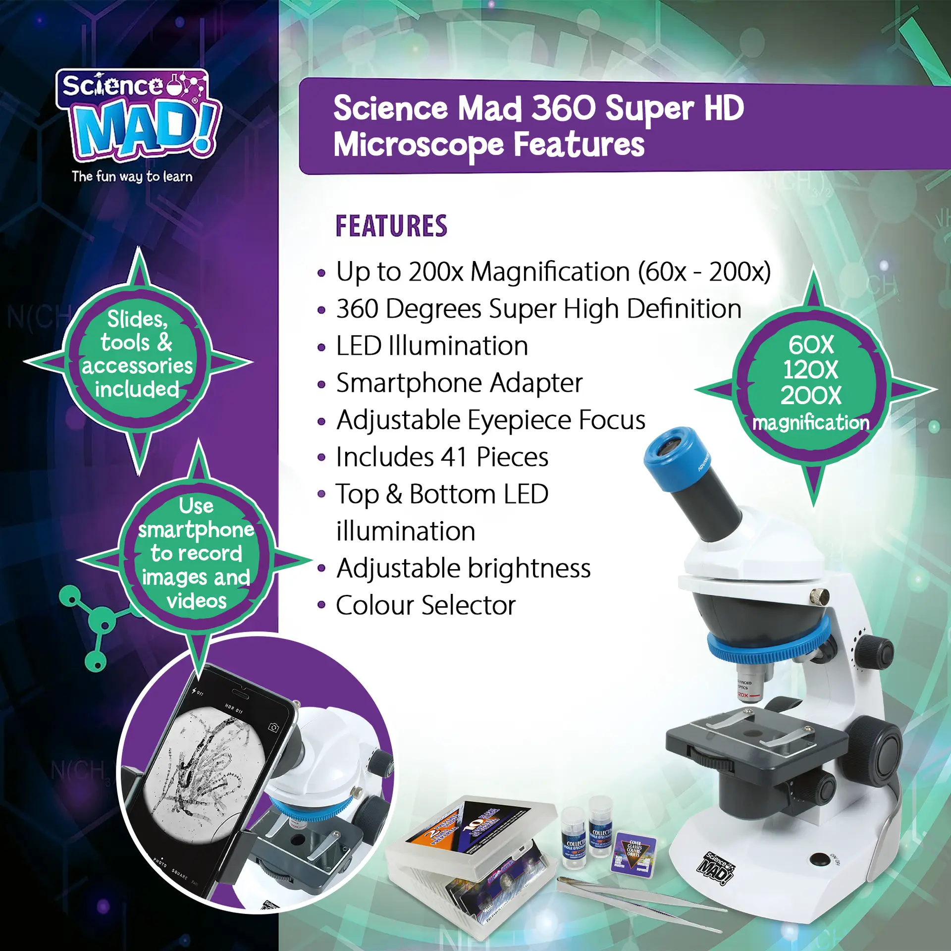 Discover the hidden world around us with the Science Mad 360° Super HD Microscope, a premium beginner‑friendly microscope designed to deliver exceptional clarity and detail. With 60x, 120x and 200x magnification, this microscope offers flexibility for examining a wide range of specimens, from plant fibres to tiny organisms.