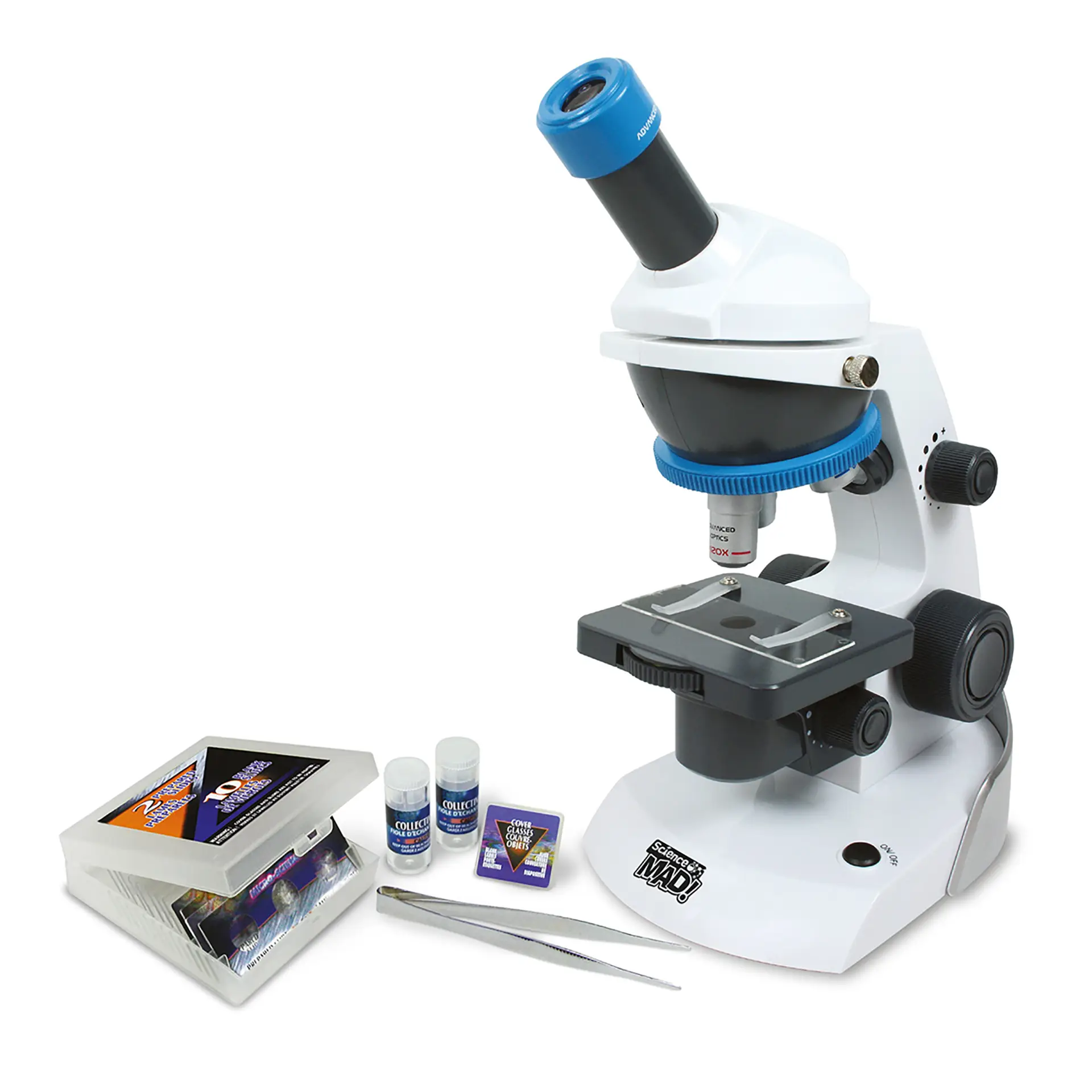The set contains 41 pieces, including 2 pre‑prepared slides, 10 blank slides, 12 cover slips, 12 labels, 2 specimen vials, tweezers and a detailed instruction manual – everything needed to collect, prepare and examine samples.
