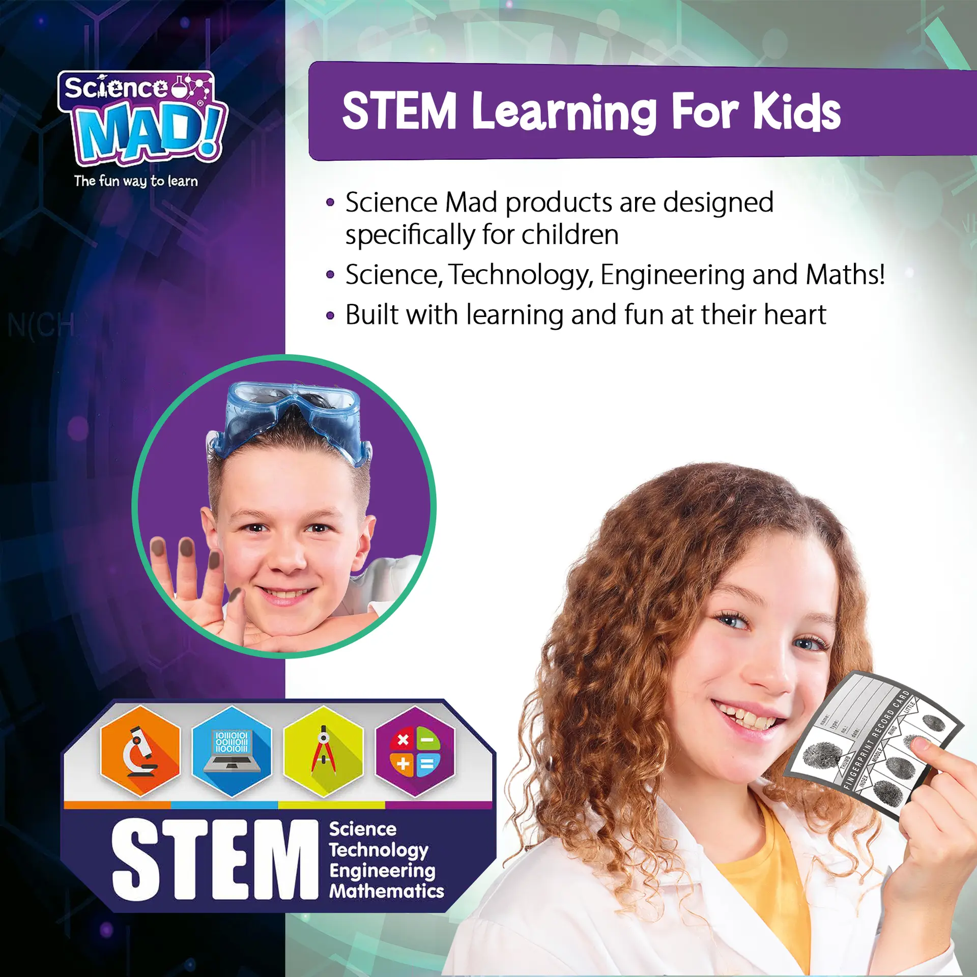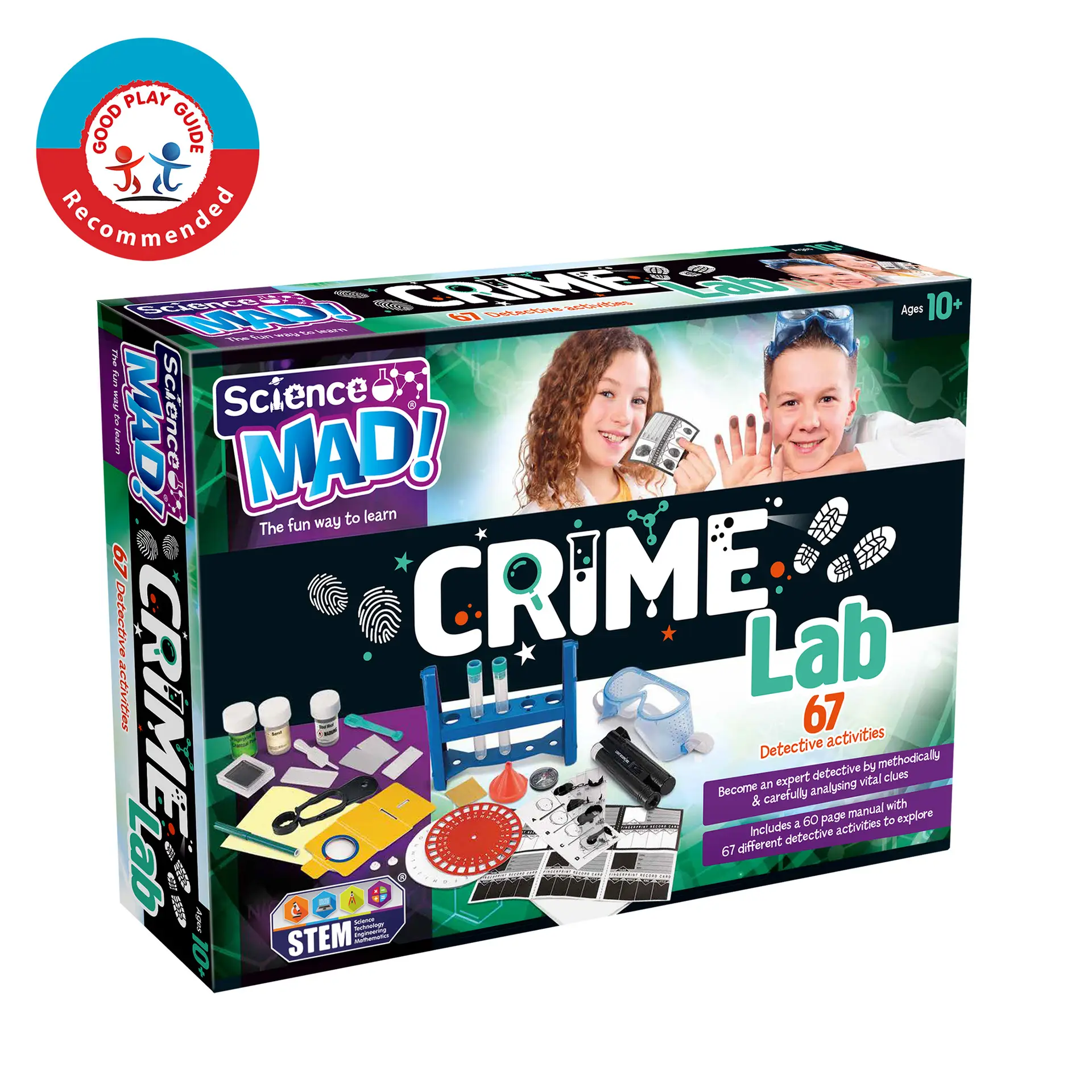 Designed to encourage STEM learning, observation, logic and problem‑solving, the Science Mad Crime Lab offers an exciting introduction to forensic science and detective work. All activities are safety‑tested and must be carried out under direct adult supervision.