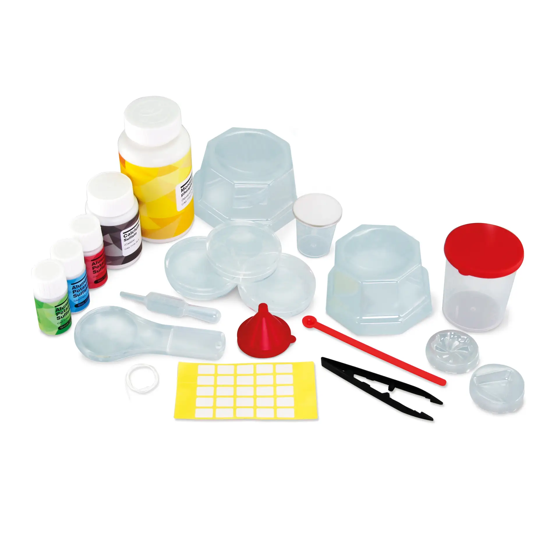 Inside the box is a complete selection of chemicals and laboratory equipment, including Aluminium Potassium Sulphate, Monoammonium Phosphate, Calcium Sulphate, red, blue and green food colourings, 3 Petri dishes, 2 plastic containers, 2 moulds, measuring cups, measuring spoon, tweezers, eye dropper, thread, magnifying glass, funnel, 15 labels, and a full instruction manual. Everything needed to begin cultivating unique crystal specimens.