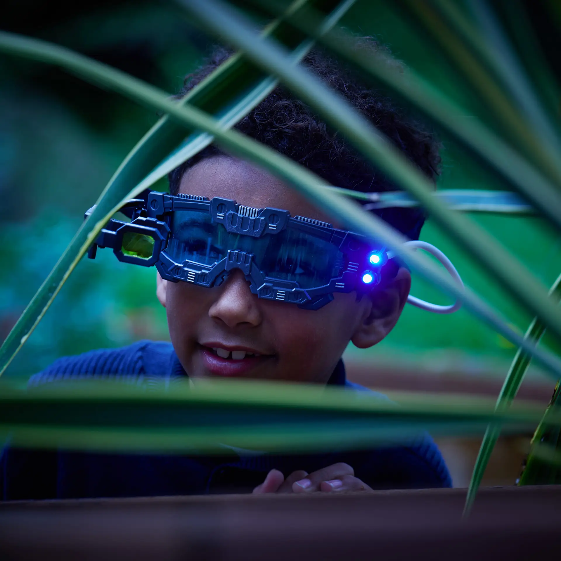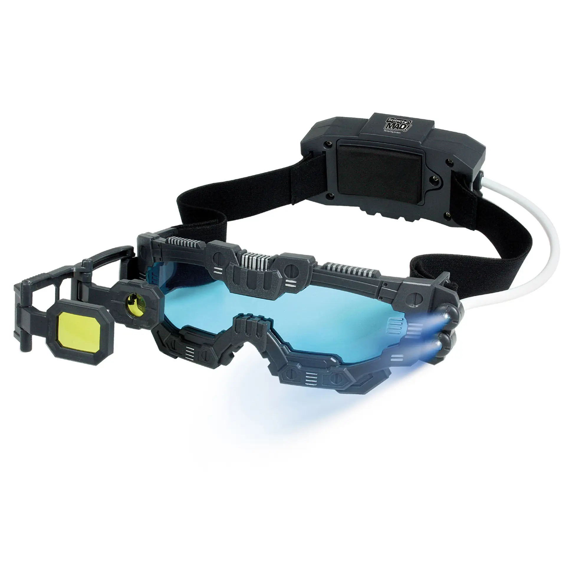 The goggles feature flip‑out 2x magnification lenses and bright LED lights that illuminate nearby objects, making it easier to investigate surroundings in low‑light conditions. The blue‑tinted lenses add to the immersive experience, while the adjustable head strap ensures a comfortable, hands‑free fit for extended play.